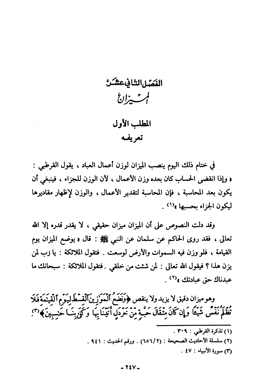 وهو ميزان دقيق لا يزيد ولا ينقص (وَنَضَعُ الْمَوَازِينَ الْقِسْطَ لِيَوْمِ الْقِيَامَةِ فَلَا تُظْلَمُ نَفْسٌ شَيْئًا وَإِن كَانَ مِثْقَالَ حَبَّةٍ مِّنْ خَرْدَلٍ أَتَيْنَا بِهَا وَكَفَى بِنَا حَاسِبِينَ) [الأنبياء: 47] .
