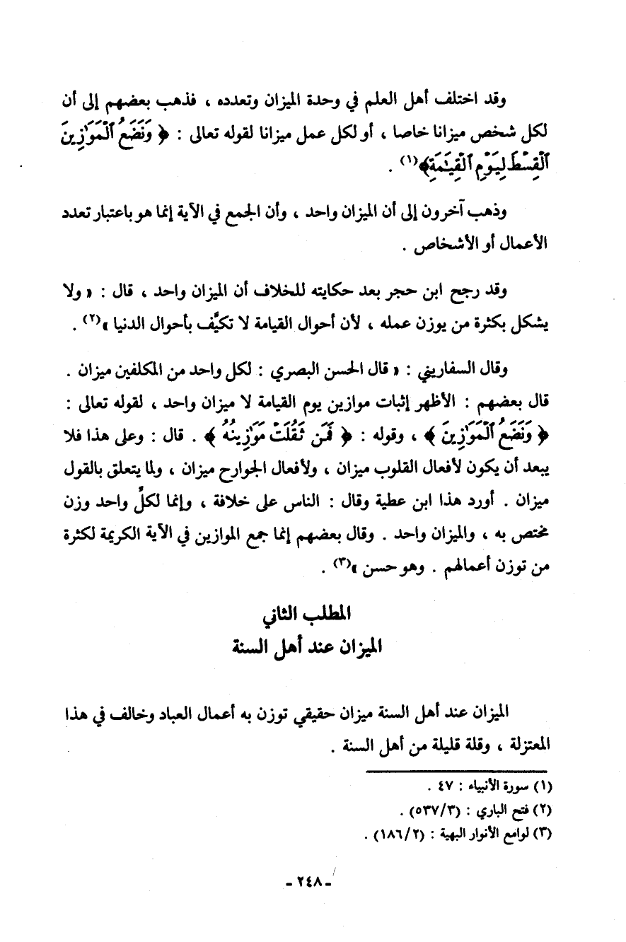 وقال السافريني: " قال الحسن البصري: لكل واحد من المكلفين ميزان. قال بعضهم: الأظهر إثبات موازين يوم القيامة لا ميزان واحد، لقوله تعالى: (وَنَضَعُ الْمَوَازِينَ) ، وقوله: (فمَن ثَقُلَتْ مَوَازِينُهُ) [الأعراف: 8] . قال: وعلى هذا فلا يبعد أن يكون لأفعال القلوب ميزان، ولأفعال الجوارح ميزان، ولما يتعلق بالقول ميزان. أورد هذا ابن عطية وقال: الناس على خلافه، وإنما لكل واحد وزن مختص به، والميزان واحد. وقال بعضهم إنما جمع الموازين في الآية الكريمة لكثرة من توزن أعمالهم. وهو حسن " (¬2) .