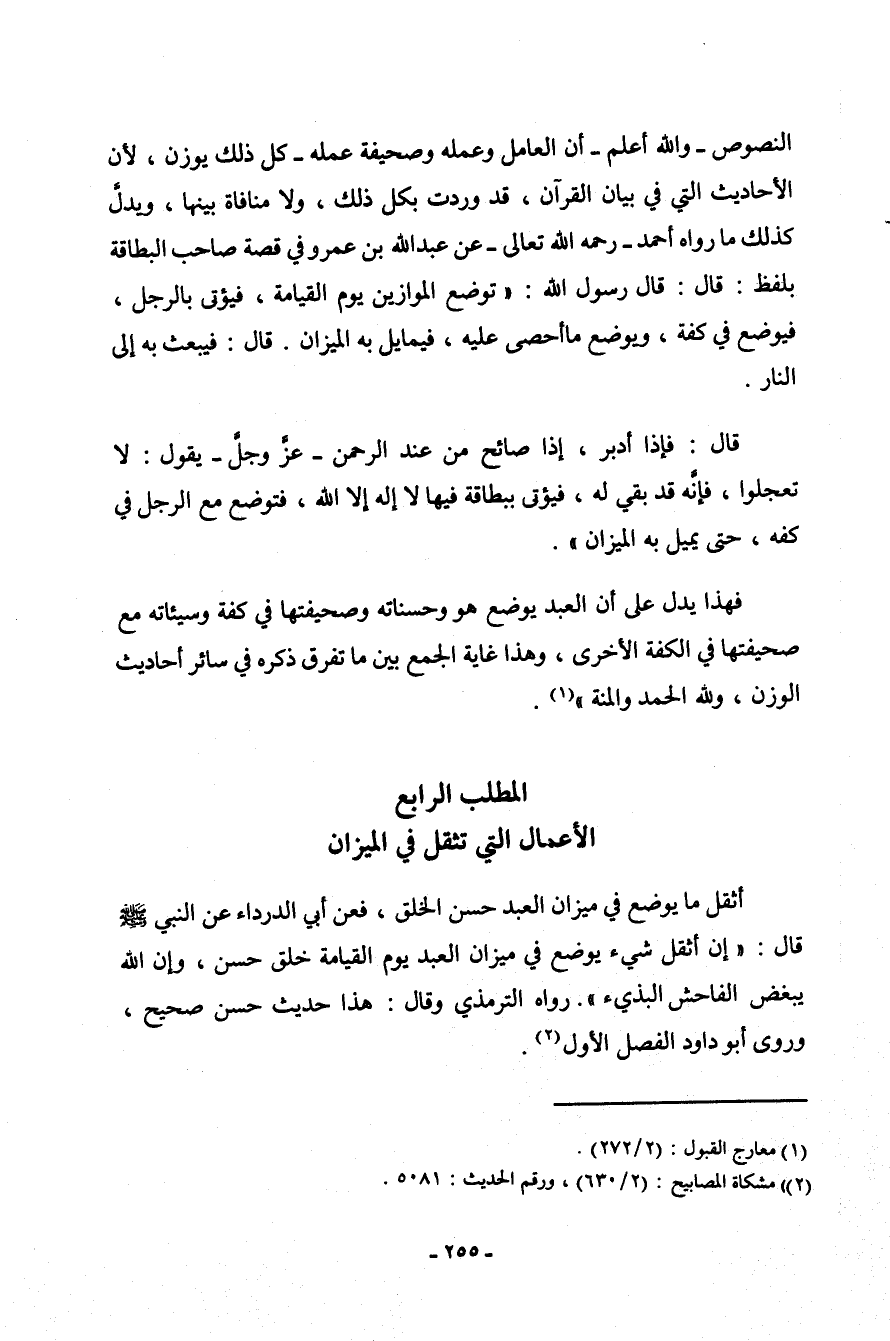 النصوص - والله أعلم - أن العامل وعمله وصحيفة عمله - كل ذلك يوزن، لأن الأحاديث التي في بيان القرآن، قد وردت بكل ذلك، ولا منافاة بينها، ويدل كذلك ما رواه أحمد - رحمه الله تعالى - عن عبد الله بن عمرو في قصة صاحب البطاقة بلفظ: قال: قال رسول الله: " توضع الموازين يوم القيامة، فيؤتى بالرجل، فيوضع في كفة، ويوضع ما أحصى عليه، فيمايل به الميزان. قال: فيبعث به إلى النار.