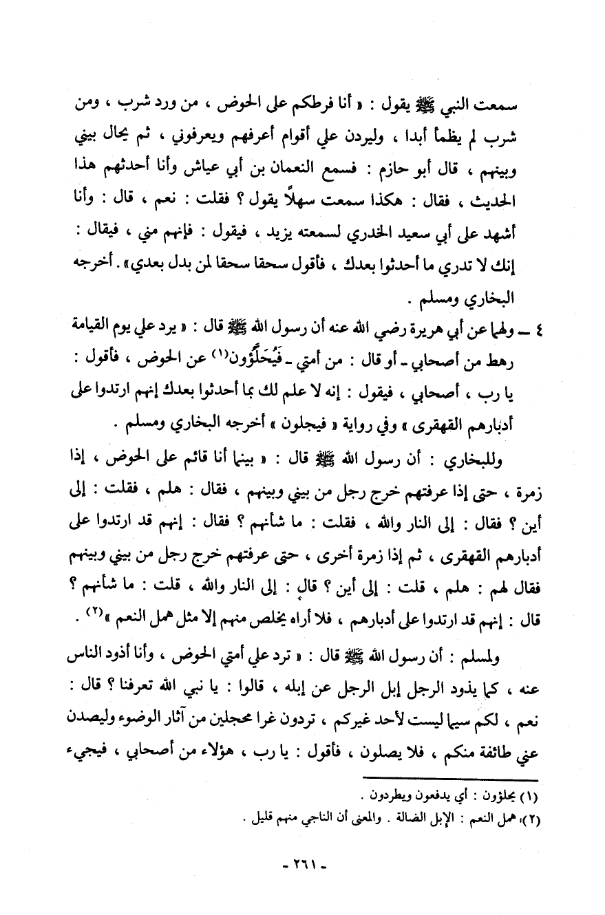 وفي أخرى: " إن حوضي أبعد من أيلة من عدن، لهو أشد بياضاً من الثلج، وأحلى من العسل باللبن، ولآنيته أكثر من عدد النجوم، وإني لأصد الناس عنه كما يصد الرجل إبل الناس عن حوضه، قالوا: يا رسول الله، أتعرفنا يومئذ؟ قال: نعم، لكما سيما (¬1) ليست
