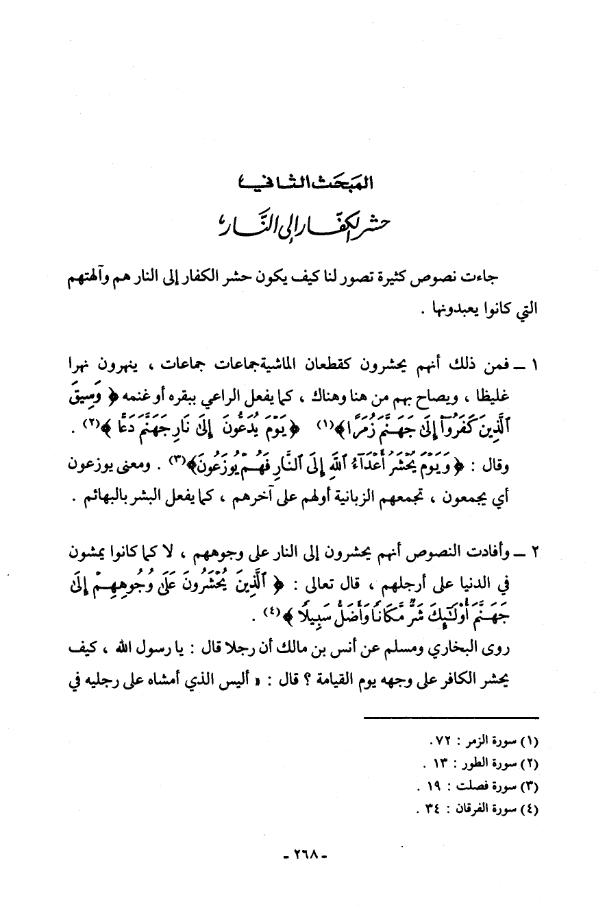 2- وأفادت النصوص أنهم يحشرون إلى النار على وجوههم، لا كما كانوا يمشون في الدنيا على أرجلهم، قال تعالى: (الَّذِينَ يُحْشَرُونَ عَلَى وُجُوهِهِمْ إِلَى جَهَنَّمَ أُوْلَئِكَ شَرٌّ مَّكَانًا وَأَضَلُّ سَبِيلًا) [الفرقان: 34] .