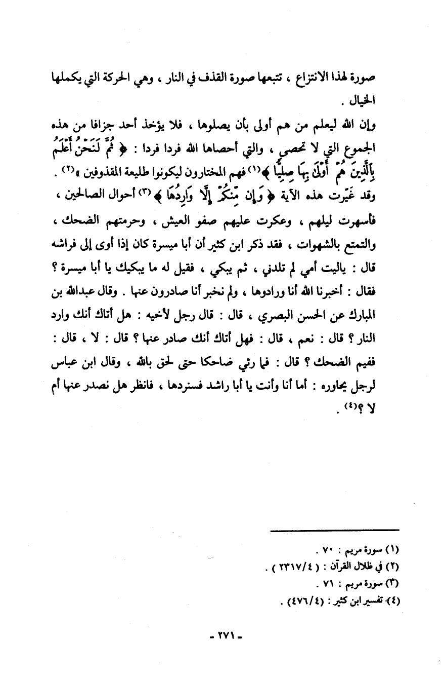 وقال عبد الله بن المبارك عن الحسن البصري، قال: قال رجل لأخيه: هل أتاك أنك وارد النار؟ قال: نعم، قال: فهل أتاك أنك صادر عنها؟ قال: لا، قال: ففيم الضحك؟ قال: فما رئي ضاحكاً حتى لحق بالله، وقال ابن عباس لرجل يحاوره: أما أنا وأنت يا أبا راشد فسنردها، فانظر هل نصدر عنها أم لا؟ (¬2) .