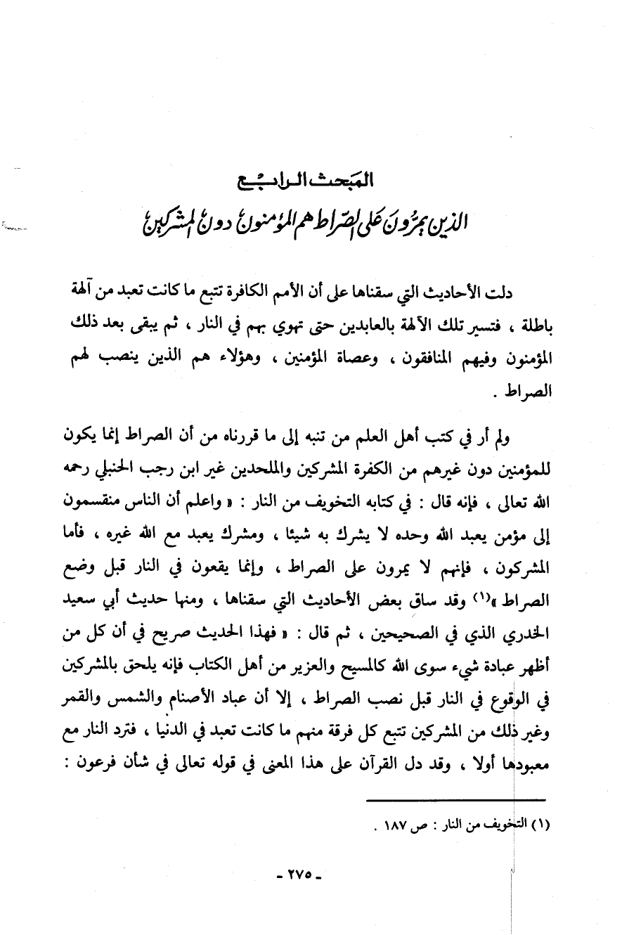 ولم أر في كتب أهل العلم من تنبه إلى ما قررناه من أن الصراط إنما يكون للمؤمنين دون غيرهم من الكفرة المشركين والملحدين غير ابن رجب الحنبلي رحمه الله تعالى، فإنه قال: في كتابه التخويف من النار: