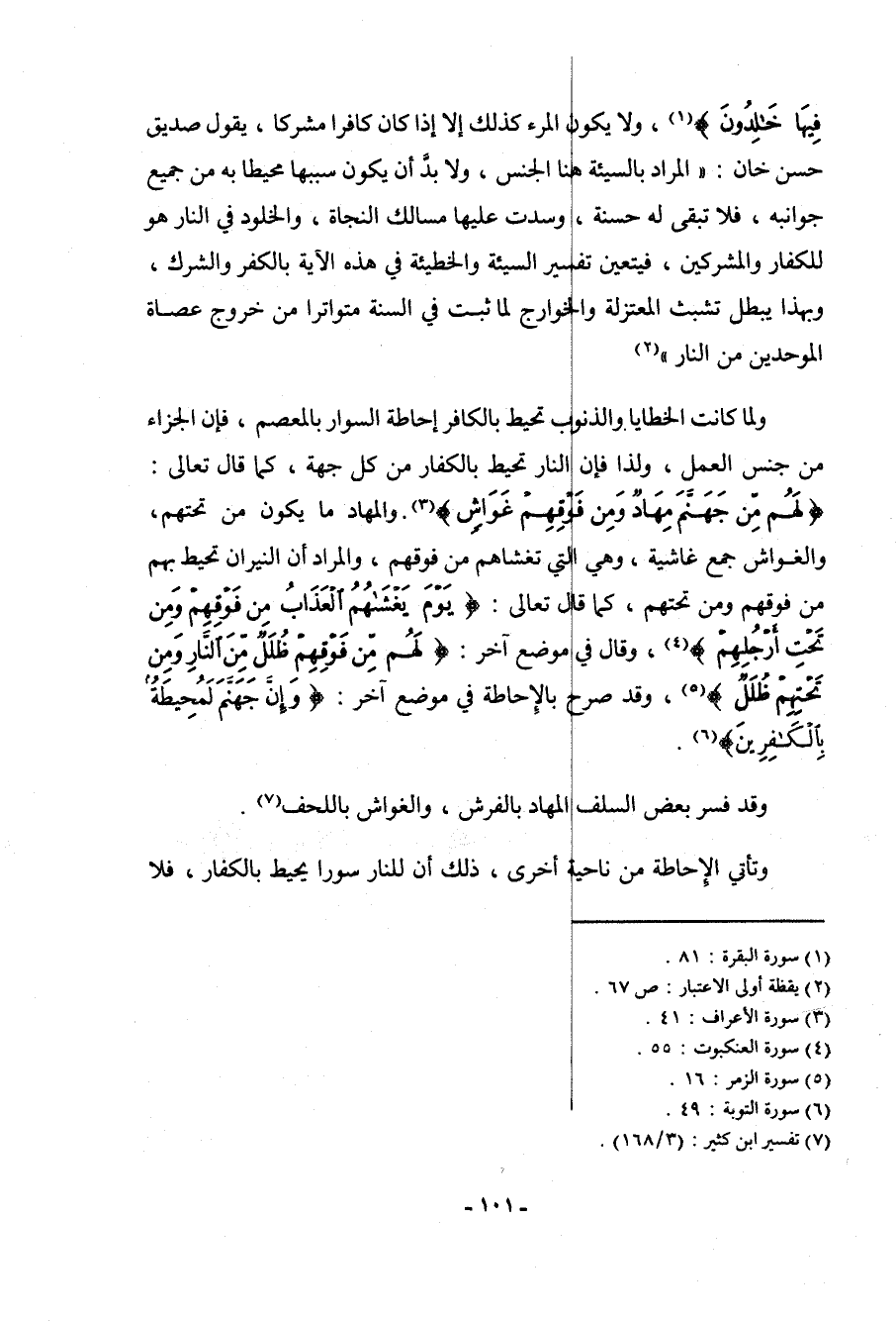 فيها خالدون) [البقرة: 81] ، ولا يكون المرء كذلك إلا إذا كان كافراً مشركاً، يقول صديق حسن خان: " المراد بالسيئة هنا الجنس، ولابد أن يكون سببها محيطاً بها من جميع جوانبه، فلا تبقى له حسنة، وسدت عليها مسالك النجاة، والخلود في النار هو للكفار والمشركين، فيتعين تفسير السيئة والخطيئة في هذه الآية بالكفر والشرك، وبهذا يبطل تشبث المعتزلة والخوارج لما ثبت في السنة متواتراً من خروج عصاة الموحدين من النار ". (¬1)