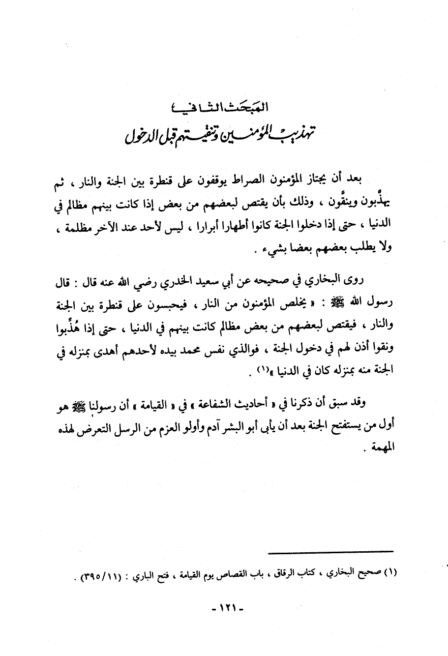 روى البخاري في صحيحه عن أبي سعيد الخدري رضي الله عنه قال: قال رسول الله - صلى الله عليه وسلم -: " يخلص المؤمنون من النار، فيحبسون على قنطرة بين الجنة والنار، فيقتص لبعضهم من بعض مظالم كانت بينهم في الدنيا، حتى إذا هذبوا ونقوا أذن لهم في دخول الجنة، فوالذي نفس محمد بيده لأحدهم أهدى بمنزلة في الجنة منه بمنزلة كان في الدنيا ". (¬1)