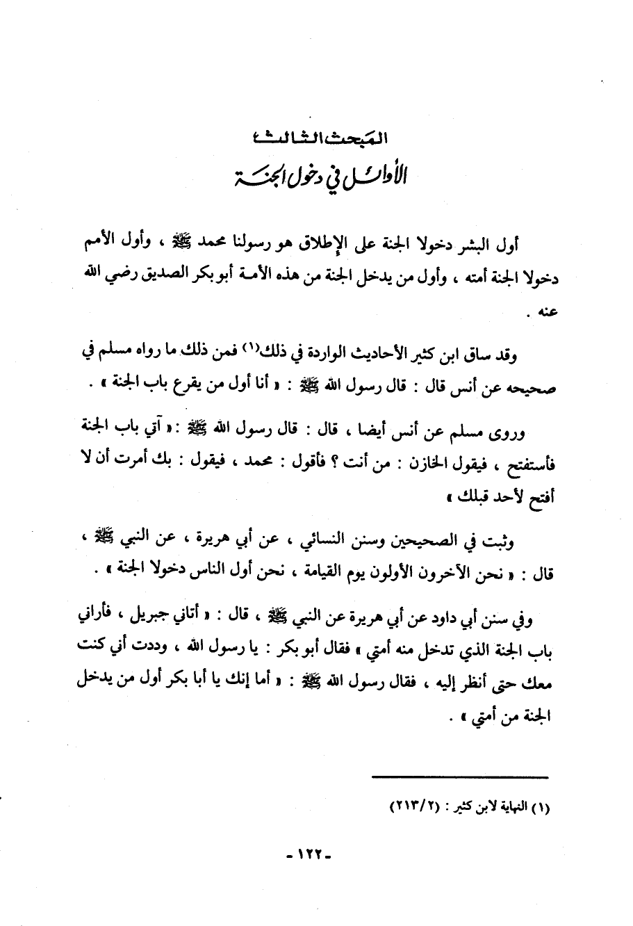 وقد ساق ابن كثير الأحاديث الواردة في ذلك (¬1) . فمن ذلك ما رواه مسلم في صحيحه عن أنس قال: قال رسول الله - صلى الله عليه وسلم -: " أنا أول من يقرع " أي: باب الجنة. وفيه أيضاً: " أنا أول شفيع في الجنة ". (¬2)