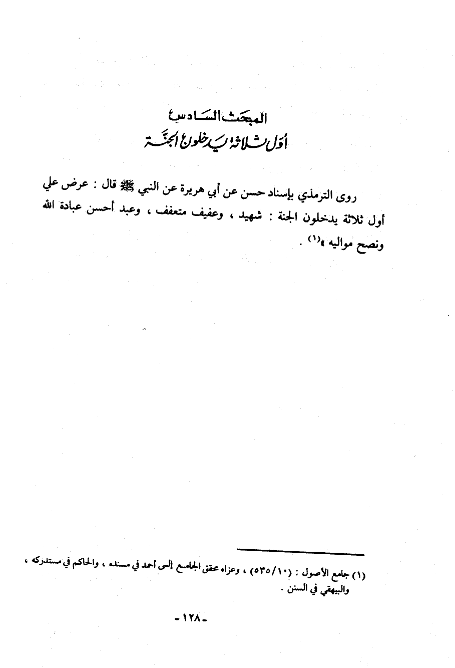روى الترمذي بإسناد حسن عن أبي هريرة عن النبي - صلى الله عليه وسلم - قال: عُرض عليّ أول ثلاثة يدخلون الجنة: " شهيد، وعفيف متعفف، وعبد أحسن عبادة الله، ونصح مواليه".