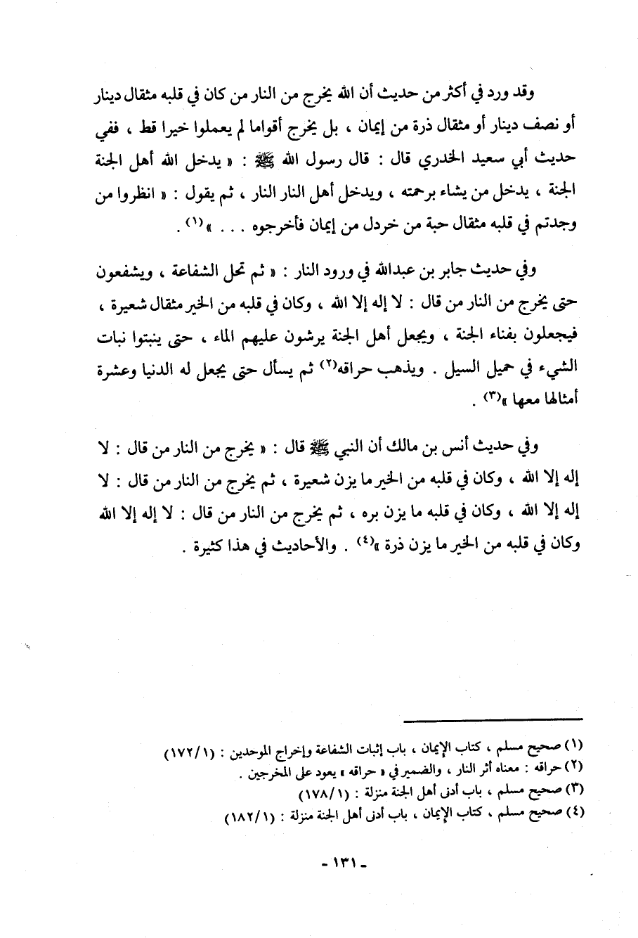 وفي حديث أنس بن مالك أن النبي - صلى الله عليه وسلم - قال: " يخرج من النار من قال: لا إله إلا الله، وكان في قلبه من الخير ما يزن شعيرة، ثم يخرج من النار من قال: لا إله إلا الله، وكان في قلبه ما يزن برة، ثم يخرج من النار من قال: لا إله إلا الله وكان في قلبه من الخير ما يزن الذرة". والأحاديث في هذا كثيرة.