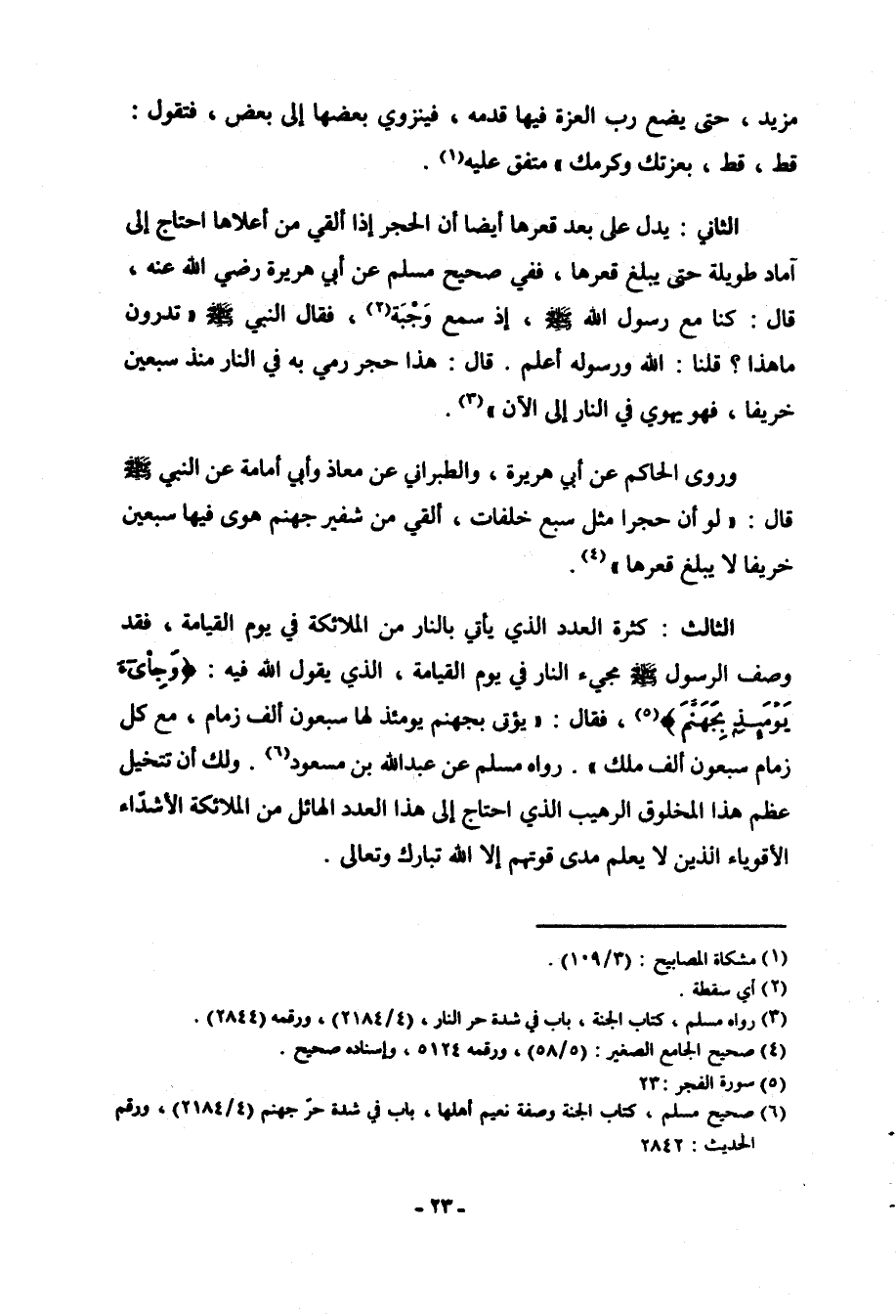 الثاني: يدل على بعد قعرها أيضاً أن الحجر إذا ألقي من أعلاها احتاج إلى آماد طويلة حتى يبلغ قعرها، ففي صحيح مسلم عن أبي هريرة رضي الله عنه، قال: كنا مع رسول الله - صلى الله عليه وسلم -، إذ سمع وَجْبَة (¬2) ، فقال النبي - صلى الله عليه وسلم -: " تدرون ما هذا؟ قلنا: الله ورسوله أعلم. قال: هذا حجر رمي به في النار منذ سبعين خريفاً، فهو يهوي في النار إلى الآن ". (¬3)