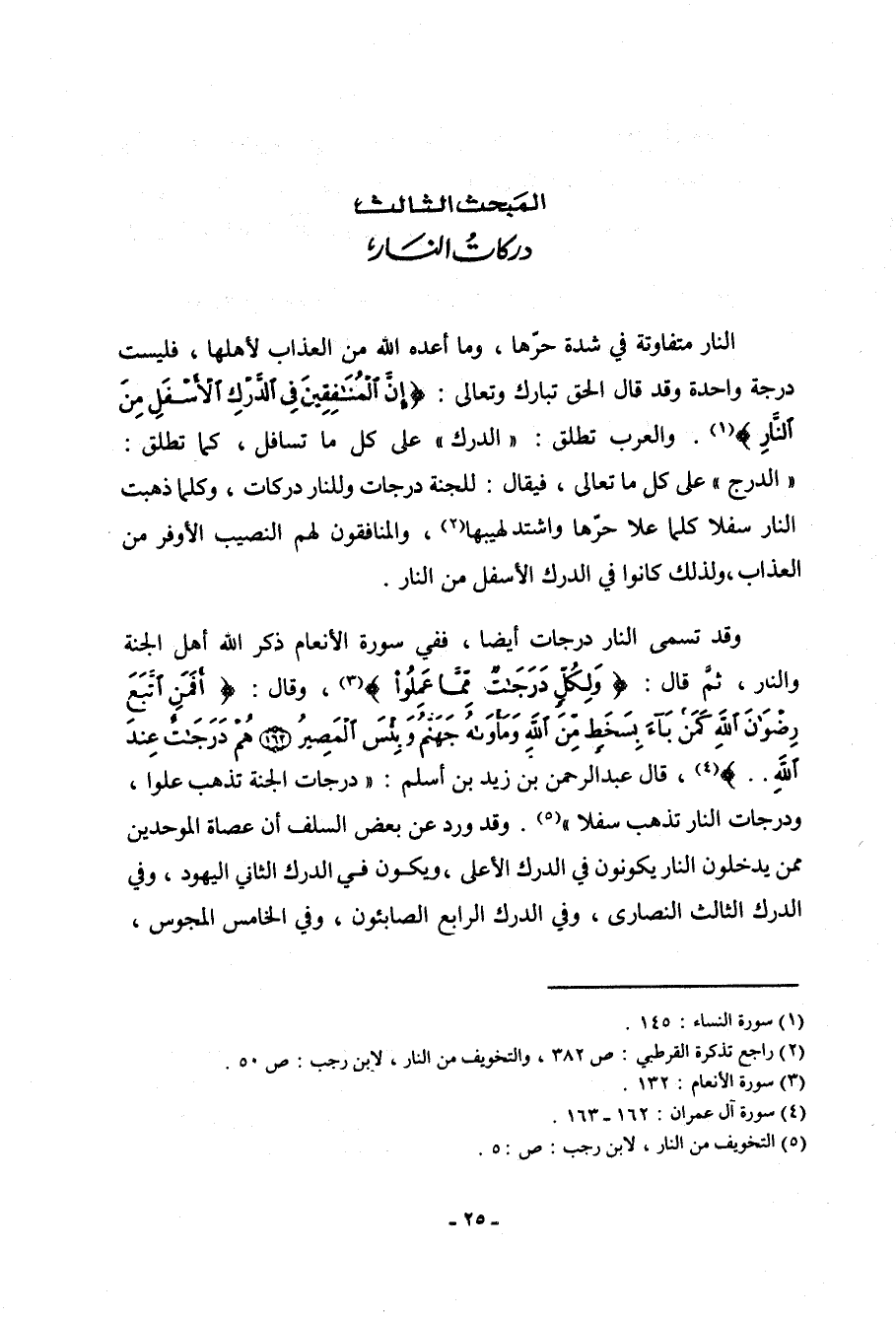 وقد تسمى النار درجات أيضاً، ففي سورة الأنعام ذكر الله أهل الجنة والنار، ثم قال: (ولكلٍ درجاتٌ مما عملوا) [الأنعام: 132] ، وقال: (أفمن اتبع رضوان الله كمن باء بسخط من الله ومأواه جهنم وبئس المصير* هم درجاتٌ عند الله..) [آل عمران: 162 - 163] ، قال عبد الرحمن بن زيد بن أسلم: " درجات الجنة تذهب علواً، ودرجات النار تذهب سفلاً " (¬2) . وقد ورد عن بعض السلف أن عصاة الموحدين ممن يدخلون النار يكونون في الدرك الأعلى، ويكون في الدرك الثاني اليهود، وفي الدرك الثالث النصارى، وفي الدرك الرابع الصائبون، وفي الخامس المجوس،