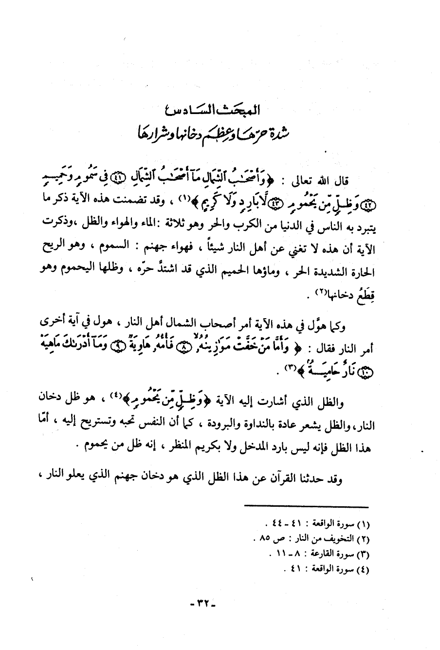 قال الله تعالى: (وأصحاب الشمال ما أصحاب الشمال*في سموم وحميم*وظل من يحموم * لا بارد ولا كريم) [الواقعة: 41 - 44] ، وقد تضمنت هذه الآية ذكر ما يتبرد به الناس من الكرب والحر وهو ثلاثة: الماء والهواء والظل، وذكرت الآية أن هذه لا تغني عن أهل النار شيئاً، فهواء جهنم: السموم، وهو الريح الحارة الشديدة الحر، وماؤها: الحميم الذي قد اشتد حره، وظلها: اليحموم وهو قطع دخانها. (¬1)