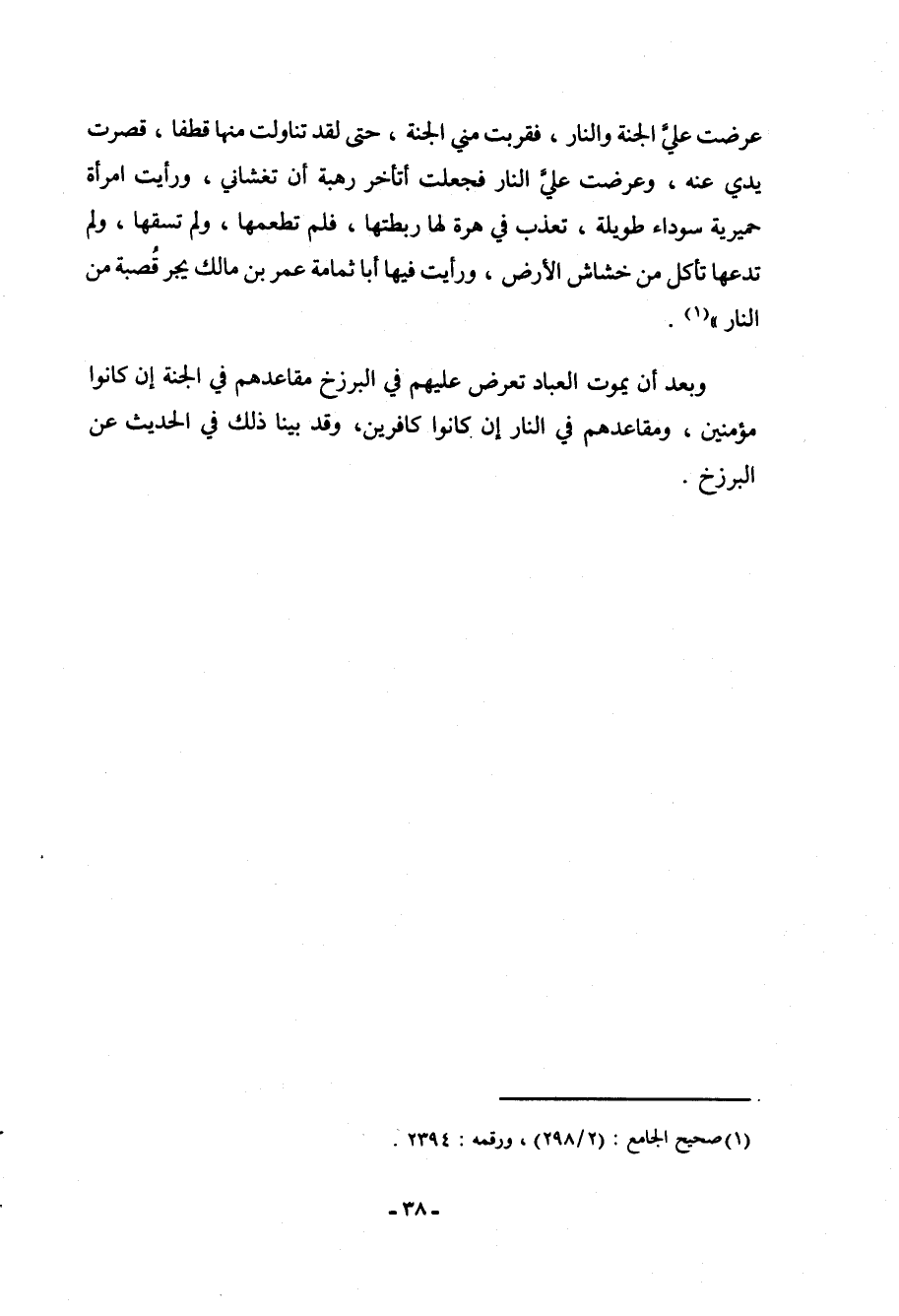 عرضت عليّ الجنة، حتى لو تناولت منها قطفاً أخذته، (أو قال: تناولت منها قطفاُ، فقصرت يدي عنه) ، وعرضت عليّ النار فرأيت فيها امرأة من بني إسرائيل تعذب في هرة لها، ربطتها فلم تطعمها، ولم تدعها تأكل من خشاش الأرض، ورأيت عمرو بن مالك يجرُّه قصبه في النار ". (¬1)