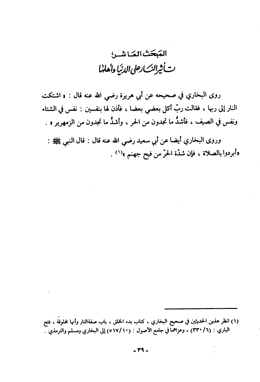 (¬1) انظر هذين الحديثين في صحيح البخاري، كتاب بدء الخلق، باب صفة النار وأنها مخلوقة، فتح الباري: (6/330) ، ورقمهما: 3258، 5259، 3260. وانظرهما في مسلم برقم: 616، 617.