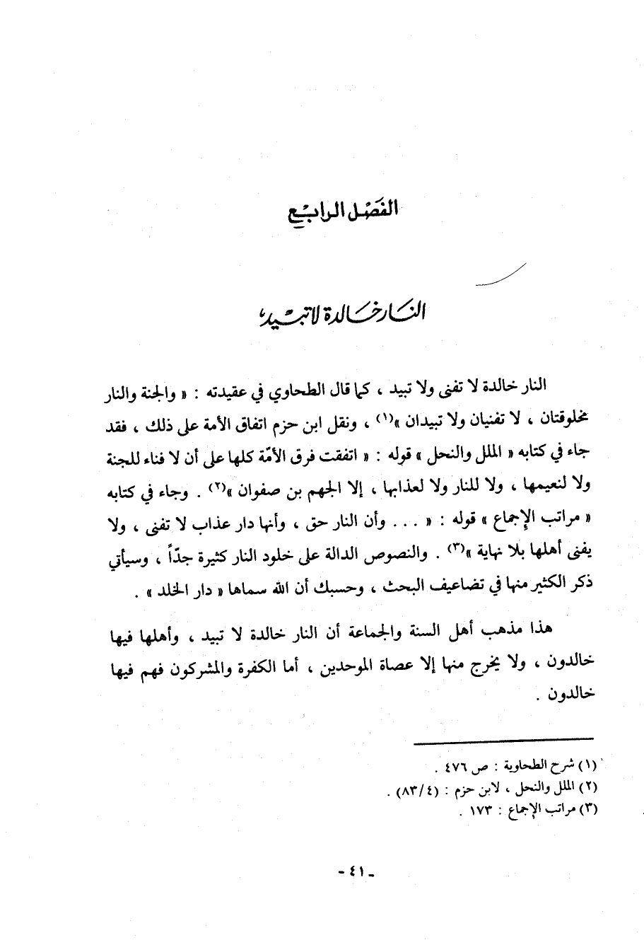 وجاء في كتابه " مراتب الإجماع" قوله: " ... وأن النار حق، وأنها دار عذاب لا تفنى، ولا يفنى أهلها بلا نهاية " (¬3) . والنصوص الدالة على خلود النار كثيرة، وحسبك أن الله سماها " دار الخلد ".