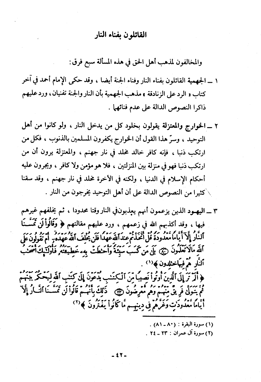 2- الخوارج والمعتزلة: يقولون بخلود كل من يدخل النار، ولو كانوا من أهل التوحيد، وسر هذا القول أن الخوارج يكفرون المسلمين بالذنوب، فكل من ارتكب ذنباً، فإنه كافر خالد مخلد في نار جهنم، والمعتزلة يرون أن من ارتكب ذنباً في منزلة بين المنزلتين، فلا هو مؤمن ولا كافر، ويجرون عليه أحكام الإسلام في الدنيا، ولكنه في الآخرة مخلد في نار جهنم، وقد سقنا كثيراً من النصوص الدالة على أن أهل التوحيد يخرجون من النار.