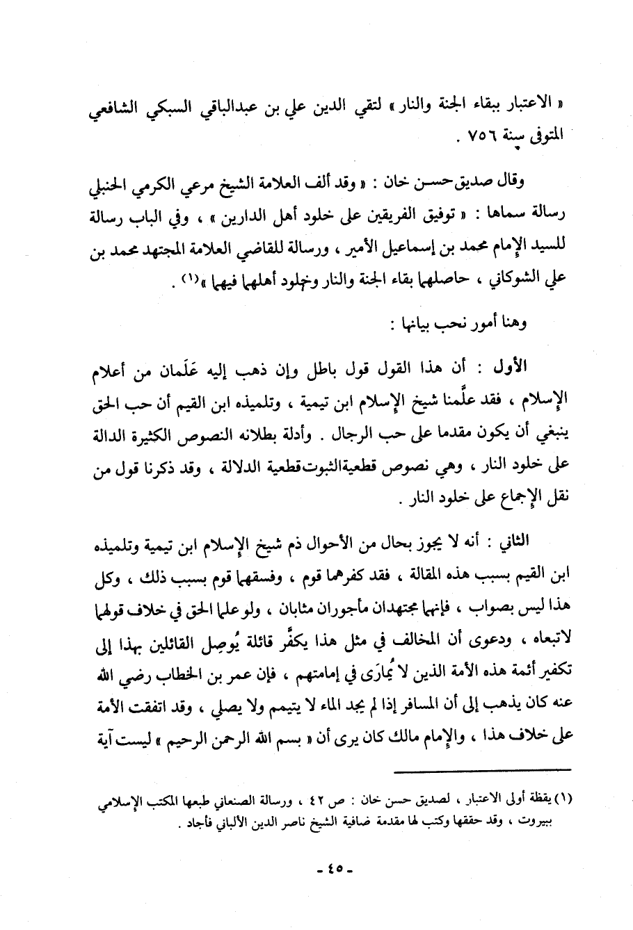 وقال صديق حسن خان: "وقد ألف العلامة الشيخ مرعي الكرمي الحنبلي رسالة سماها: " توفيق الفريقين على خلود أهل الدارين "، وفي الباب رسالة للسيد الإمام محمد بن إسماعيل الأمير، ورسالة للقاضي العلامة المجتهد محمد بن علي الشوكاني، حاصلهما بقاء الجنة والنار وخلود أهلهما فيهما ". (¬1)