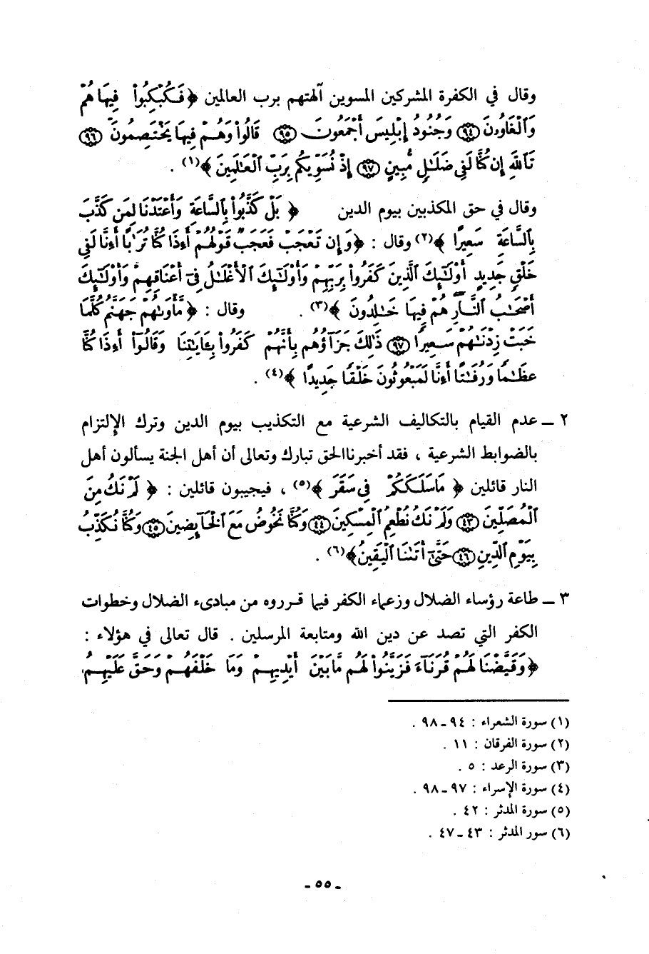 وقال في حق المكذبين بيوم الدين: (بل كذبوا بالساعة وأعتدنا لمن كذب بالساعة سعيرا) [الفرقان: 11] ، (وإن تعجب فعجب قولهم أءذا كنا تراباً أءنا لفي خلق جديد أولئك الذين كفروا بربهم وأولئك الأغلال في أعناقهم وأولئك أصحاب النار هم فيها خالدون) [الرعد: 5] . وقال: (مأواهم جهنم كلما خبت زدناهم سعيرا*ذلك بأنهم كفروا بآياتنا وقالوا أءذا كنا عظاماً ورفاتاً أءنا لمبعوثون خلقاً جديدا) [الإسراء: 97-98] .