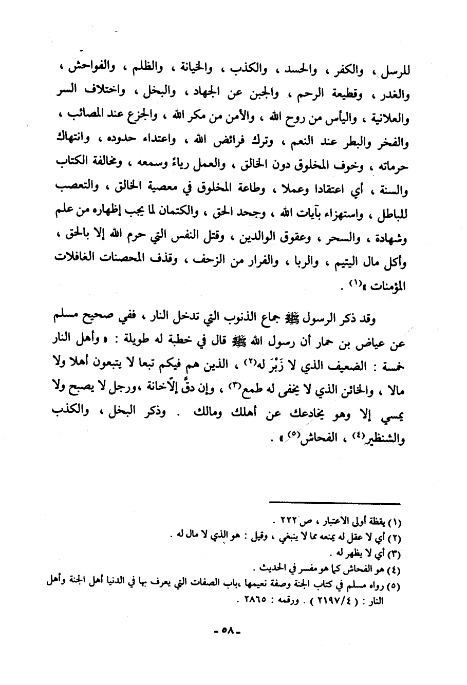 وقد ذكر الرسول - صلى الله عليه وسلم - جماع الذنوب التي تدخل النار، ففي صحيح مسلم عن عياض بن حمار أن رسول الله - صلى الله عليه وسلم - قال في خطبة له طويلة: " وأهل النار خمسة: الضعيف الذي لا زَبْرَ له (¬2) ، الذين هم فيكم تبعاً لا يبتغون أهلا ولا مالاً، والخائن الذي لا يخفى له طمع (¬3) ، وإن دقّ إلا خانه، ورجل لا يصبح ولا يمسى إلا وهو يخادعك عن أهلك ومالك. وذكر البخل، والكذب، والشنظير (¬4) ، الفحاش ". (¬5)