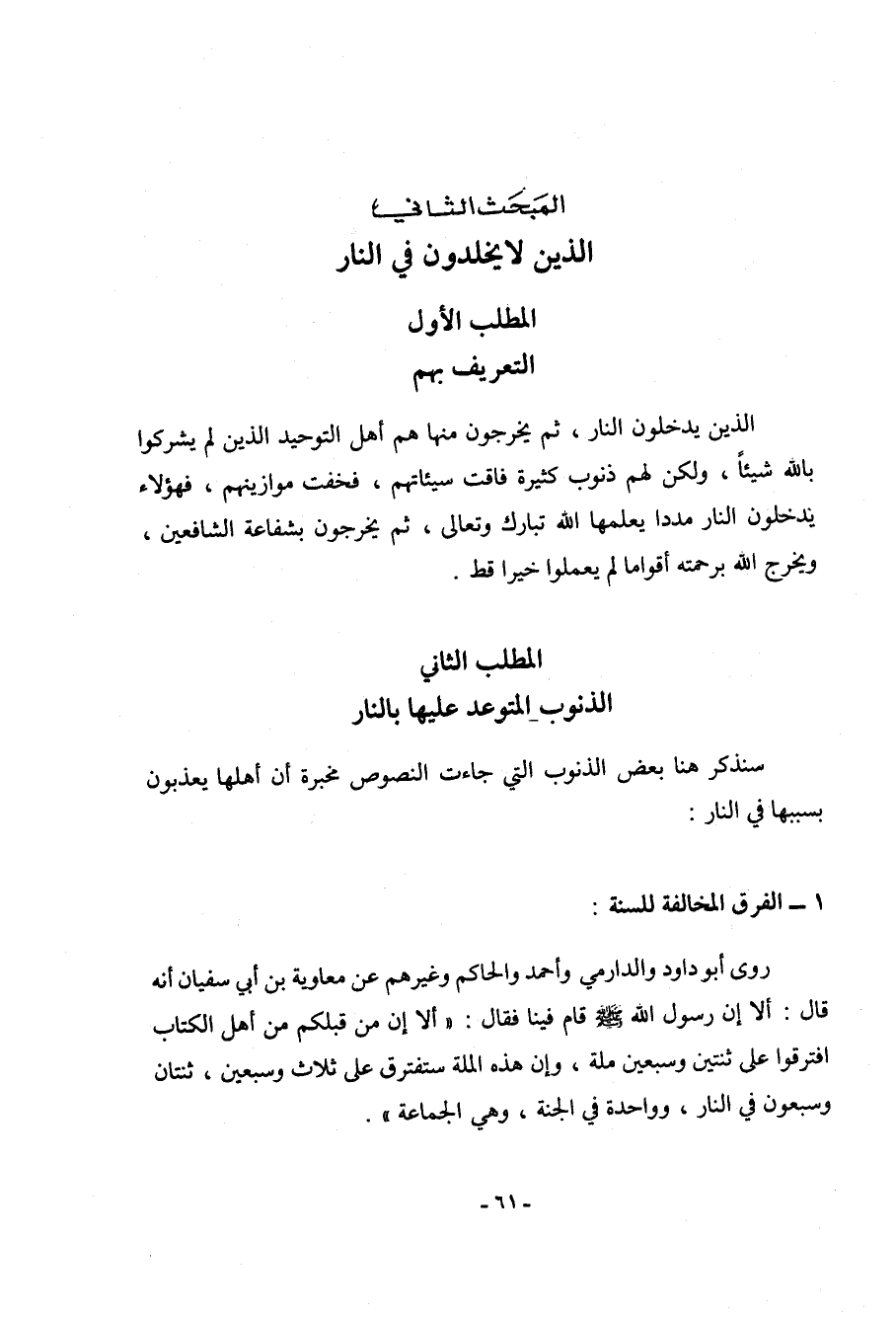 روى أبو داود والدارمي وأحمد والحاكم وغيرهم عن معاوية بن أبي سفيان أنه قال: ألا إن رسول الله - صلى الله عليه وسلم - قام فينا فقال: " ألا إن من قبلكم من أهل الكتاب افترقوا على ثنتين وسبعين ملة، وإن هذه الملة ستفترق على ثلاث وسبعين، ثنتان وسبعون في النار، وواحدة في الجنة، وهي الجماعة ".