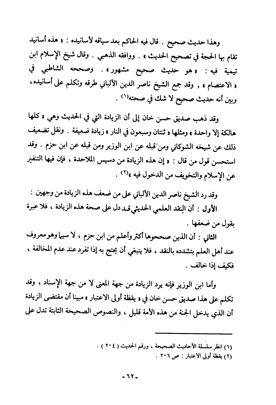 وأما ابن الوزير فإنه يرد الزيادة من جهة المعنى لا من جهة الإسناد، وقد تكلم على هذا صديق حسن خان في "يقظة أولى الاعتبار" مبيناً أن مقتضى الزيادة أن الذي يدخل الجنة من هذه الأمة قليل، والنصوص الصحيحة الثابتة تدل على