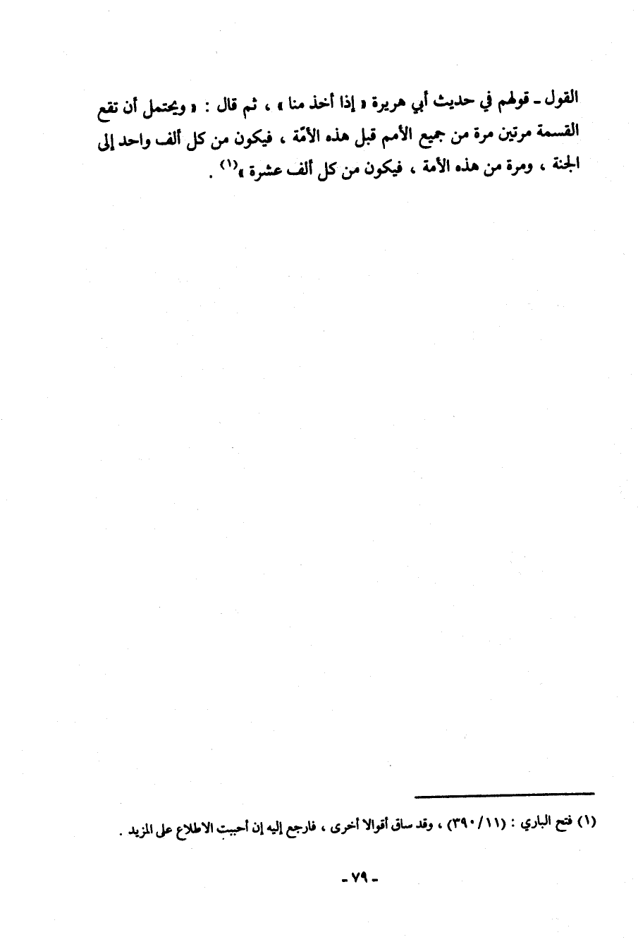القول – قولهم في حديث أبى هريرة " إذا أخذ منا "، ثم قال: " ويحتمل أن تقع القسمة مرتين مرة من جميع الأمم قبل هذه الأمة، فيكون من كل ألف واحد إلى الجنة، ومرة من هذه الأمة، فيكون من كل ألف عشرة ". (¬1)