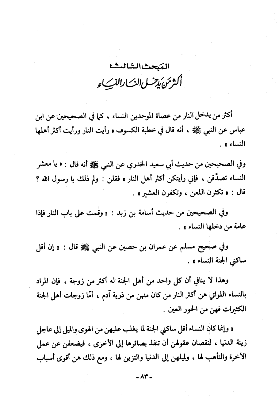 أكثر من يدخل النار من عصاة الموحدين النساء، كما في الصحيحين عن ابن عباس عن النبي - صلى الله عليه وسلم -، إنه قال في خطبة الكسوف " أريت النار، فلم أر منظر كاليوم أفظع، ورأيت أكثر أهلها النساء ". (¬1)