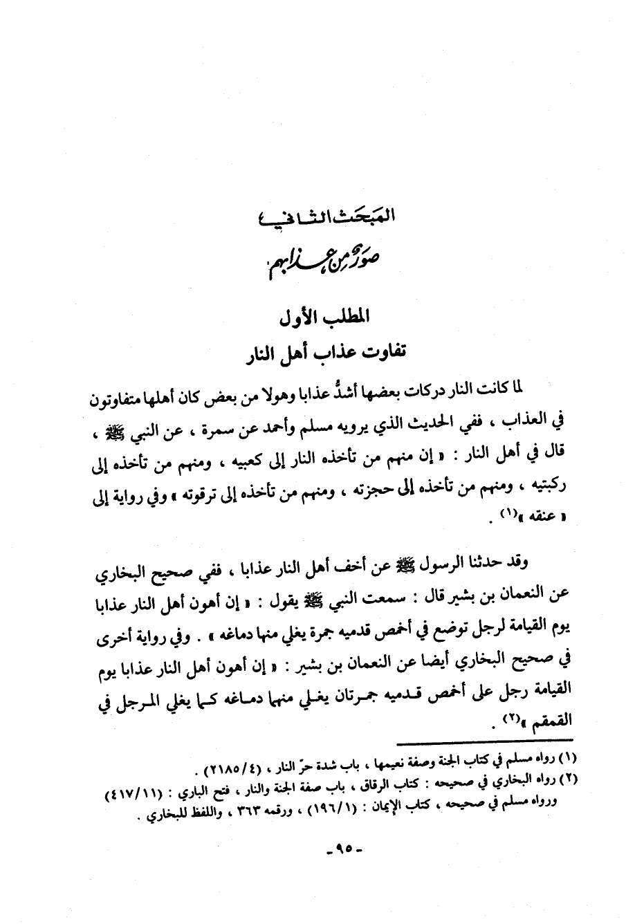 وقد حدثنا الرسول - صلى الله عليه وسلم - عن أخف أهل النار عذاباً، ففي صحيح البخاري عن النعمان بن بشير قال: سمعت النبي - صلى الله عليه وسلم - يقول: " إن أهون أهل النار عذاباً يوم القيامة لرجل توضع في أخمص قدميه جمرة يغلي منها دماغه ". وفي رواية أخرى في صحيح البخاري أيضاً عن النعمان بن بشير: " إن أهون أهل النار عذاباً يوم القيامة رجل على أخمص قدميه جمرتان يغلي منهما دماغه كما يغلي المرجل في القمقم ". (¬2)