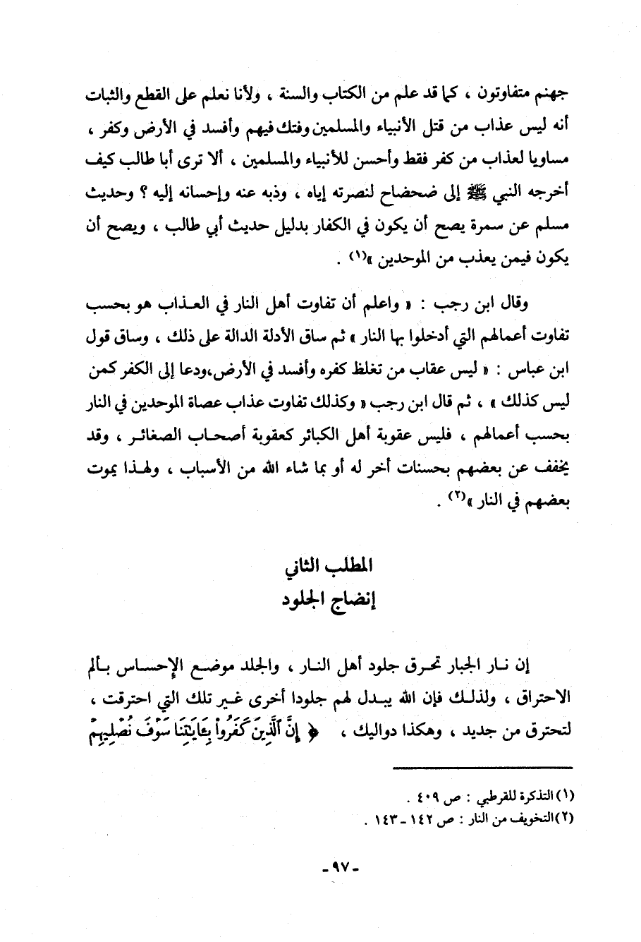 وقال ابن رجب: " واعلم أن تفاوت أهل النار في العذاب هو بحسب تفاوت أعمالهم التي أدخلوا بها النار " ثم ساق الأدلة الدالة على ذلك، وساق قول ابن عباس: " ليس عقاب من تغلظ كفره وأفسد في الأرض ودعا إلى الكفر كمن ليس كذلك" ثم قال ابن رجب: " وكذلك تفاوت عذاب عصاة الموحدين في النار بحسب أعمالهم، فليس عقوبة أهل الكبائر كعقوبة أهل الصغائر، وقد يخفف عن بعضهم بحسنات أخرى له أو بما شاء الله من الأسباب، ولهذا يموت بعضهم في النار ". (¬2)