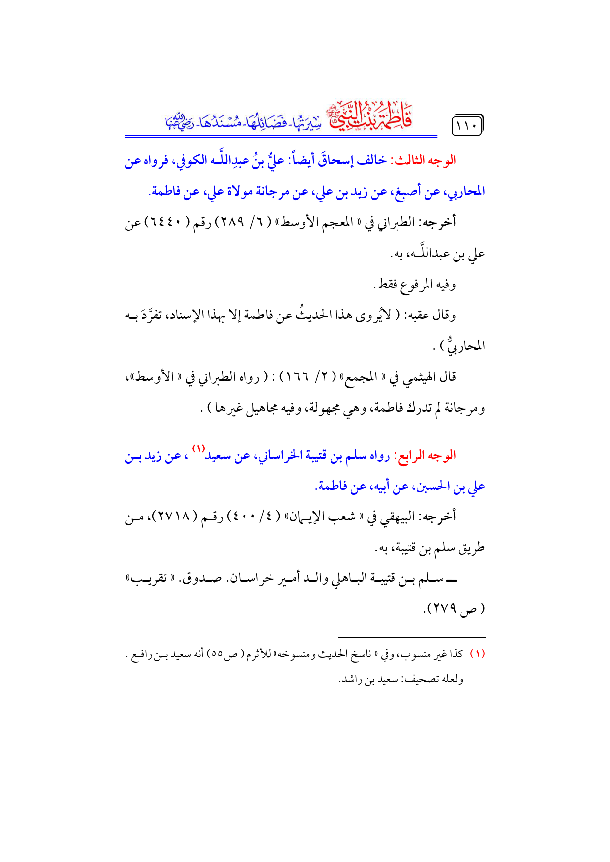 الوجه الثالث: خالف إسحاقَ أيضاً: عليُّ بنُ عبدِاللَّه الكوفي، فرواه عن المحاربي، عن أصبغ، عن زيد بن علي، عن مرجانة مولاة علي، عن فاطمة.