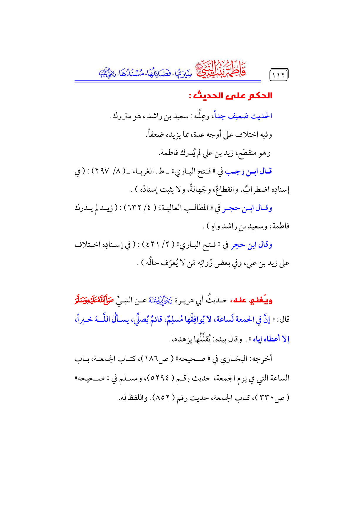 وقال ابن حجر في «المطالب العالية» (٤/ ٦٣٢): (زيد لم يدرك فاطمة، وسعيد بن راشد واهٍ).