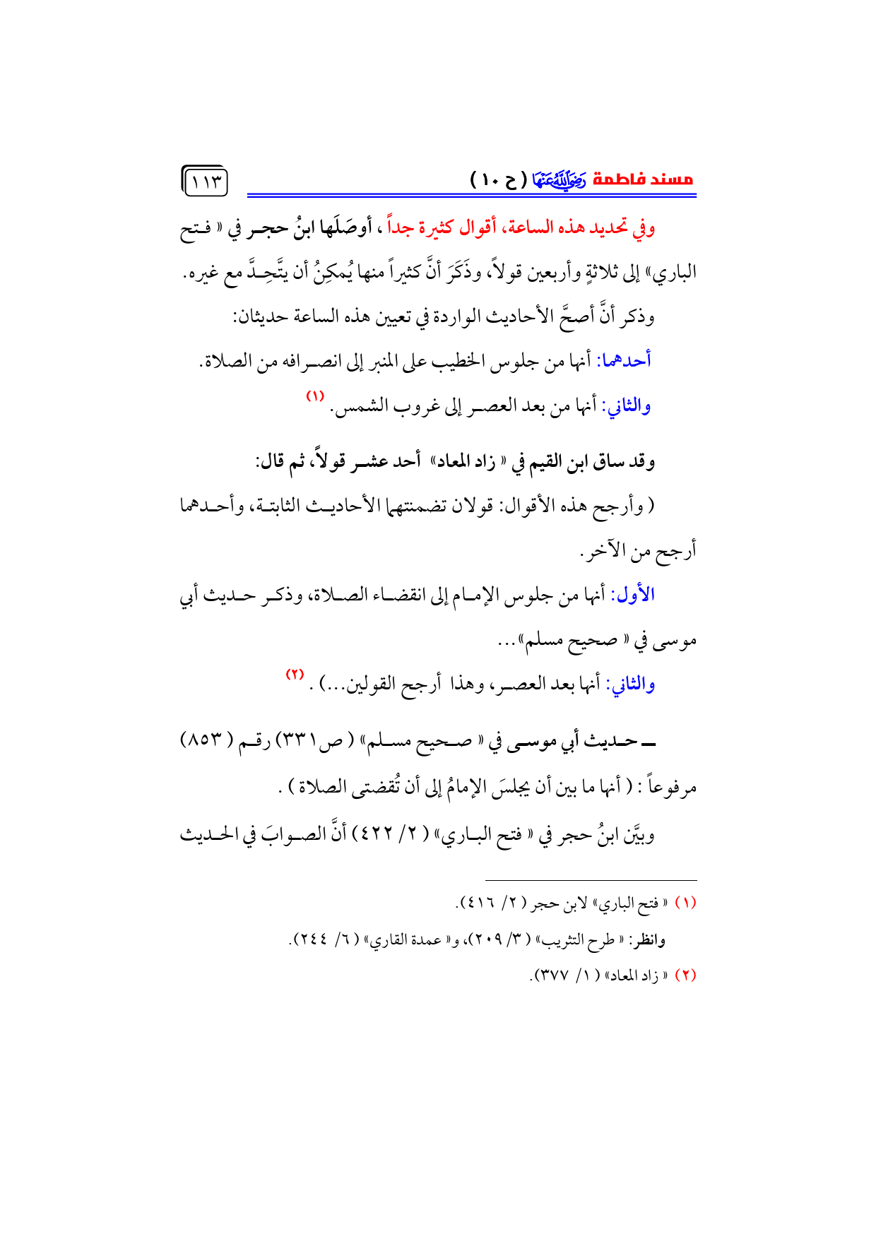 وذكر أنَّ أصحَّ الأحاديث الواردة في تعيين هذه الساعة حديثان: