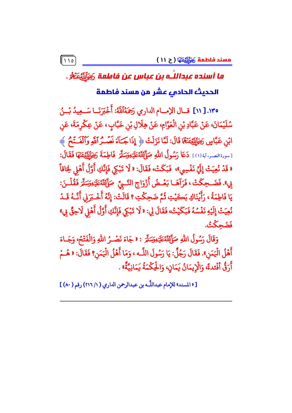١٣٥. [١١] قال الإمام الدارمي - رحمه الله -: أَخْبَرَنَا سَعِيدُ بْنُ سُلَيْمَانَ، عَنْ عَبَّادِ بْنِ الْعَوَّامِ، عَنْ هِلَالِ بْنِ خَبَّابٍ، عَنْ عِكْرِمَةَ، عَنِ ابْنِ عَبَّاسٍ - رضي الله عنهما - قَالَ: لَمَّا نَزَلَتْ ... { ... إِذَا جَاءَ نَصْرُ اللَّهِ وَالْفَتْحُ} [سورة النصر، آية (١)] دَعَا رَسُولُ اللهِ - صلى الله عليه وسلم - فَاطِمَةَ - رضي الله عنها - فَقَالَ: «قَدْ نُعِيَتْ إِلَيَّ نَفْسِي»، فَبَكَتْ، فَقَالَ: «لَا تَبْكِي فَإِنَّكِ أَوَّلُ أَهْلِي لِحَاقاً بِي». فَضَحِكَتْ، فَرَآهَا بَعْضُ أَزْوَاجِ النَّبِيِّ - صلى الله عليه وسلم - فَقُلْنَ: ... يَا فَاطِمَةُ، رَأَيْنَاكِ بَكَيْتِ ثُمَّ ضَحِكْتِ؟ قَالَتْ: إِنَّهُ أَخْبَرَنِي أَنَّهُ قَدْ نُعِيَتْ إِلَيْهِ نَفْسُهُ فَبَكَيْتُ، فَقَالَ لِي: «لَا تَبْكِي فَإِنَّكِ أَوَّلُ أَهْلِي لَاحِقٌ بِي» فَضَحِكْتُ.