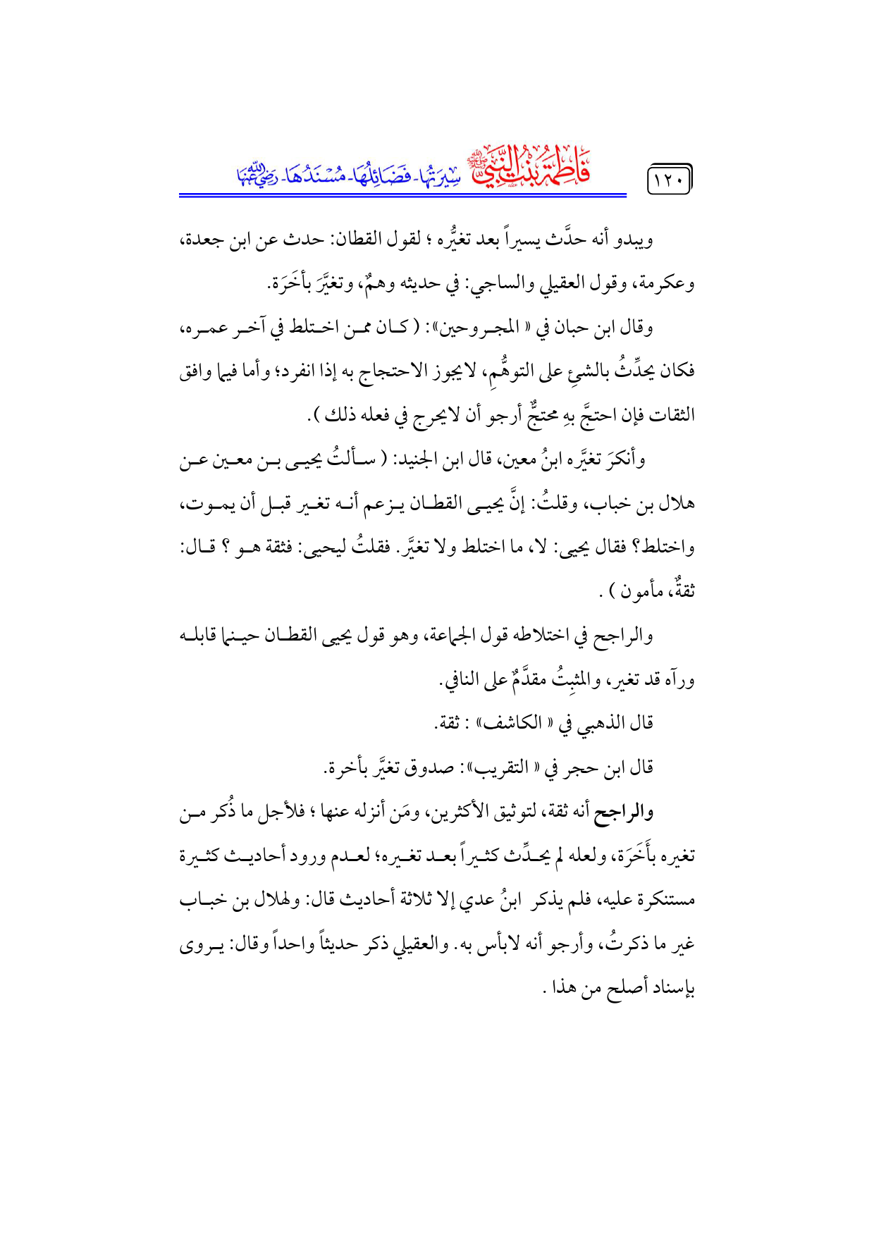 والراجح أنه ثقة، لتوثيق الأكثرين، ومَن أنزله عنها؛ فلأجل ما ذُكر من تغيره بأَخَرَة، ولعله لم يحدِّث كثيراً بعد تغيره؛ لعدم ورود أحاديث كثيرة مستنكرة عليه، فلم يذكر ابنُ عدي إلا ثلاثة أحاديث قال: ولهلال بن خباب غير ما ذكرتُ، وأرجو أنه لابأس به. والعقيلي ذكر حديثاً واحداً وقال: يروى بإسناد أصلح من هذا.