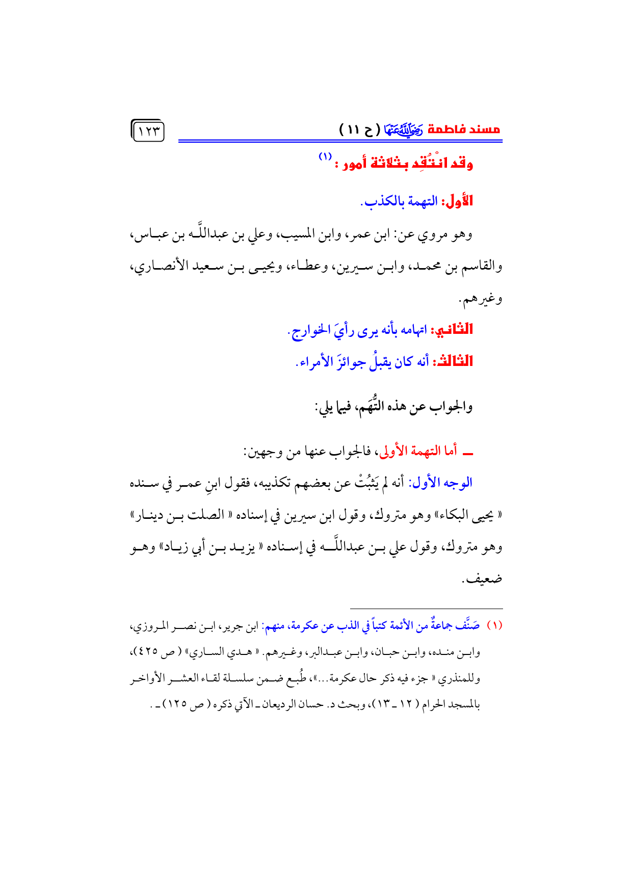 (¬١) صَنَّف جماعةٌ من الأئمة كتباً في الذب عن عكرمة، منهم: ابن جرير، ابن نصر المروزي، وابن منده، وابن حبان، وابن عبدالبر، وغيرهم. «هدي الساري» (ص ٤٢٥)، وللمنذري «جزء فيه ذكر حال عكرمة ... »، طُبع ضمن سلسلة لقاء العشر الأواخر بالمسجد الحرام (١٢ ـ ١٣)، وبحث د. حسان الرديعان ـ الآتي ذكره (ص ١٢٥) ـ.