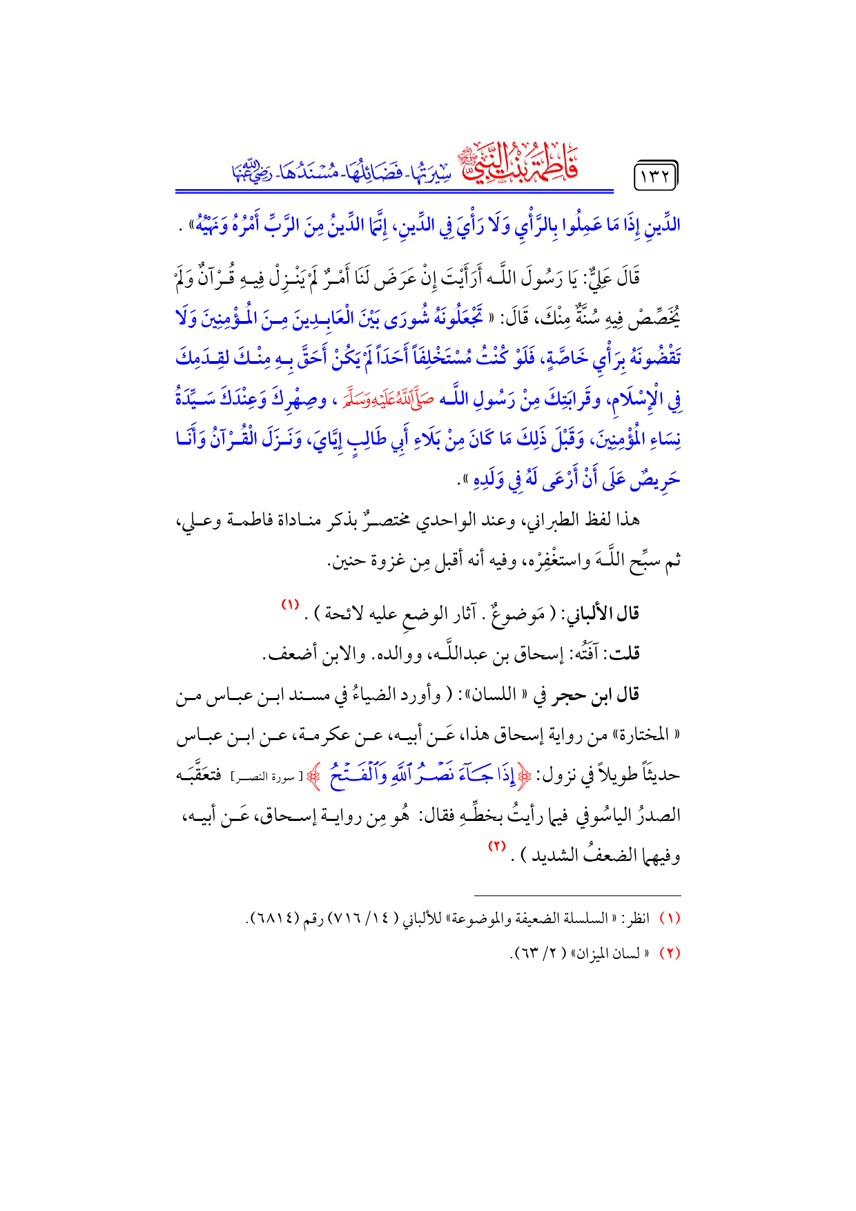 قال ابن حجر في «اللسان»: (وأورد الضياءُ في مسند ابن عباس من ... «المختارة» من رواية إسحاق هذا، عَن أبيه، عن عكرمة، عن ابن عباس حديثَاً طويلاً في نزول: {إِذَا جَاءَ نَصْرُ اللَّهِ وَالْفَتْحُ} [سورة النصر] فتعَقَّبَه الصدرُ الياسُوفي فيما رأيتُ بخطِّهِ فقال: هُو مِن رواية إسحاق، عَن أبيه، وفيهما الضعفُ الشديد). (¬٢)