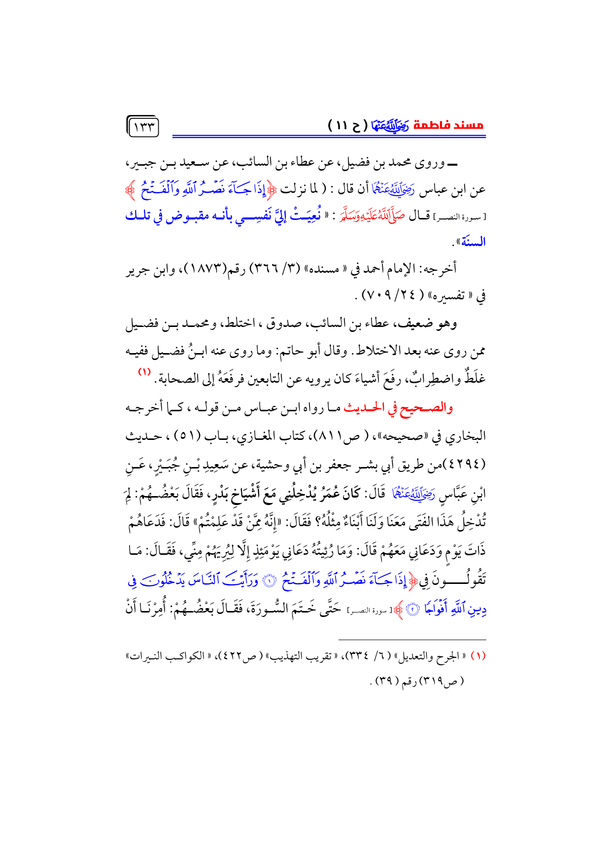 ــ وروى محمد بن فضيل، عن عطاء بن السائب، عن سعيد بن جبير، عن ابن عباس - رضي الله عنهما - أن قال: (لما نزلت {إِذَا جَاءَ نَصْرُ اللَّهِ وَالْفَتْحُ} [سورة النصر] قال - صلى الله عليه وسلم -: «نُعِيَتْ إليَّ نَفسِي بأنه مقبوض في تلك السنَة».