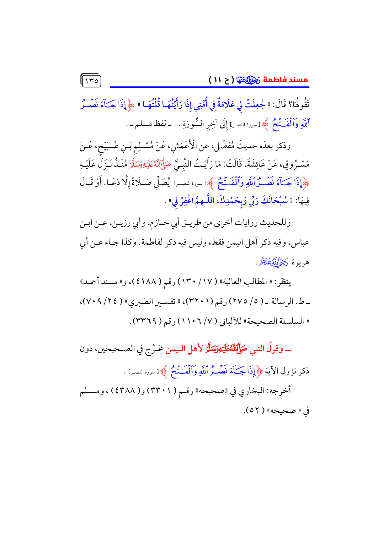 ــ وقولُ النبي - صلى الله عليه وسلم - لأهل اليمن مخرَّج في الصحيحين، دون ذكر نزول الآية {إِذَا جَاءَ نَصْرُ اللَّهِ وَالْفَتْحُ} [سورة النصر].