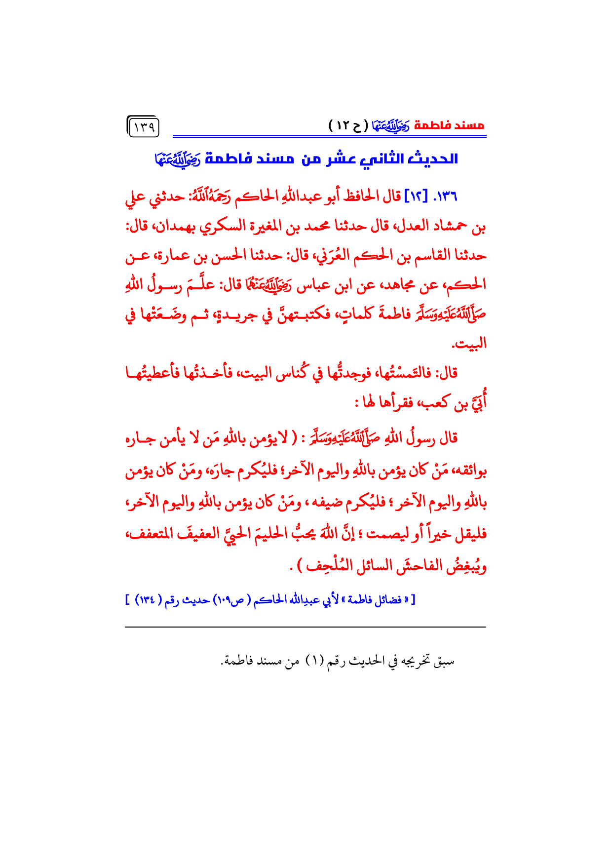 [«فضائل فاطمة» لأبي عبدِالله الحاكم (ص ١٠٩) حديث رقم (١٣٤)]