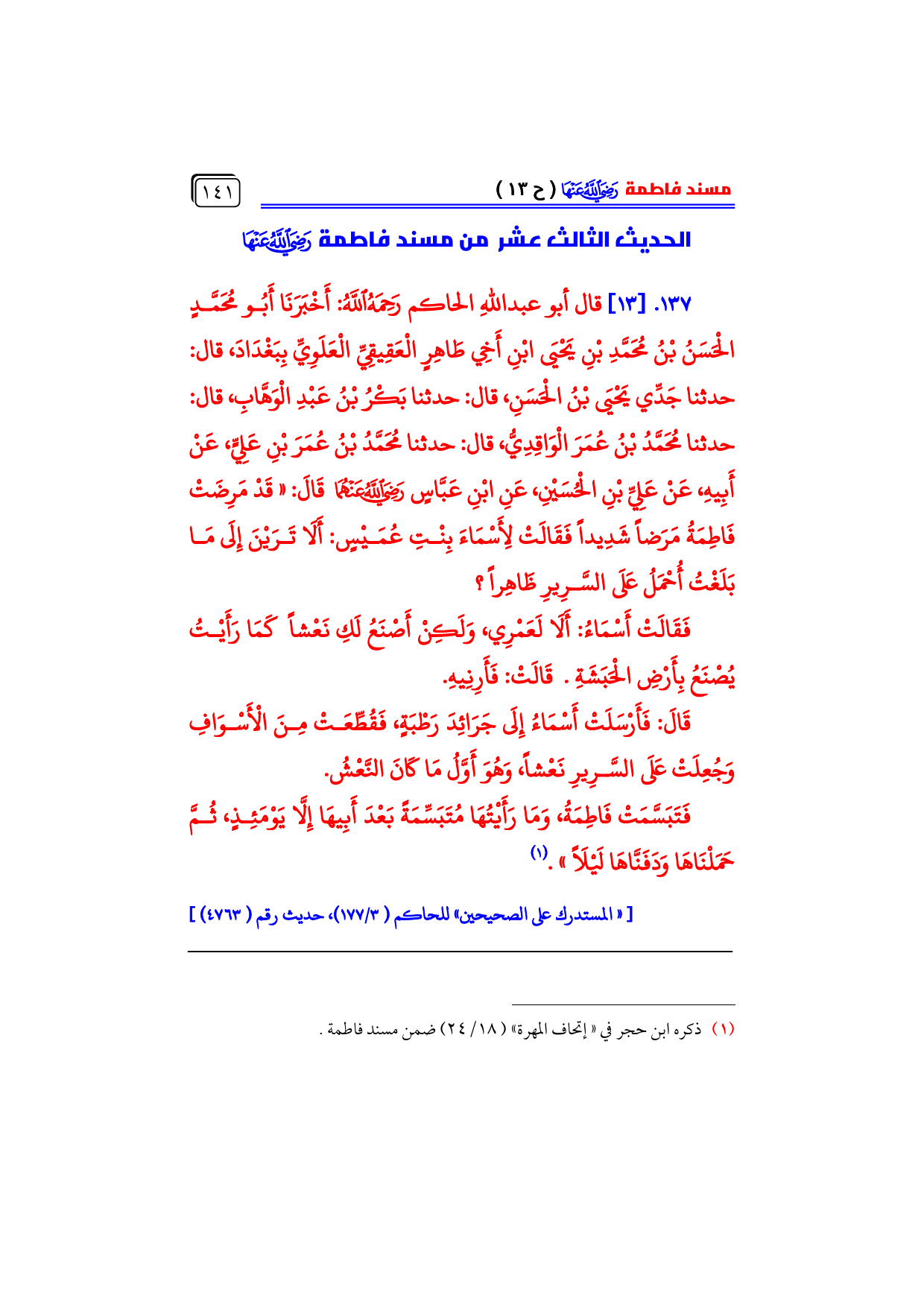 ١٣٦. [١٣] قال أبو عبداللهِ الحاكم - رحمه الله -: أَخْبَرَنَا أَبُو مُحَمَّدٍ الْحَسَنُ بْنُ مُحَمَّدِ بْنِ يَحْيَى ابْنِ أَخِي طَاهِرٍ الْعَقِيقِيِّ الْعَلَوِيِّ بِبَغْدَادَ، قال: حدثنا جَدِّي يَحْيَى بْنُ الْحَسَنِ، قال: حدثنا بَكْرُ بْنُ عَبْدِ الْوَهَّابِ، قال: حدثنا مُحَمَّدُ بْنُ عُمَرَ الْوَاقِدِيُّ، قال: حدثنا مُحَمَّدُ بْنُ عُمَرَ بْنِ عَلِيٍّ، عَنْ أَبِيهِ، عَنْ عَلِيِّ بْنِ الْحُسَيْنِ، عَنِ ابْنِ عَبَّاسٍ - رضي الله عنهما - قَالَ: «قَدْ مَرِضَتْ فَاطِمَةُ مَرَضاً شَدِيداً فَقَالَتْ لِأَسْمَاءَ بِنْتِ عُمَيْسٍ: أَلَا تَرَيْنَ إِلَى مَا بَلَغْتُ أُحْمَلُ عَلَى السَّرِيرِ ظَاهِراً؟