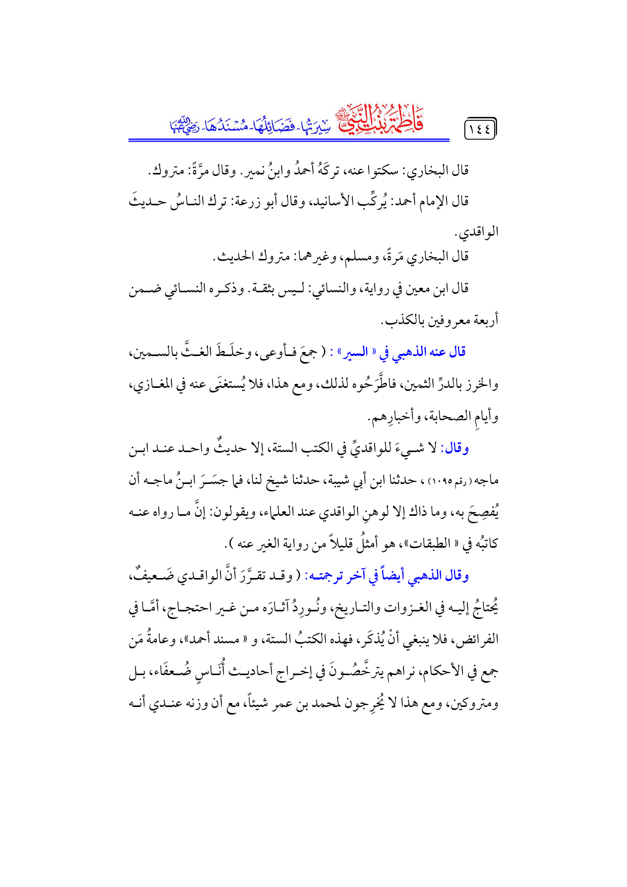 وقال الذهبي أيضاً في آخر ترجمته: (وقد تقرَّرَ أنَّ الواقدي ضَعيفٌ، يُحتاجُ إليه في الغزوات والتاريخ، ونُورِدُ آثارَه من غير احتجاج، أمَّا في الفرائض، فلا ينبغي أنْ يُذكَر، فهذه الكتبُ الستة، و «مسند أحمد»، وعامةُ مَن جمع في الأحكام، نراهم يترخَّصُونَ في إخراج أحاديث أُنَاسٍ ضُعفَاء، بل ومتروكين، ومع هذا لا يُخرِجون لمحمد بن عمر شيئاً، مع أن وزنه عندي أنه ... ـ