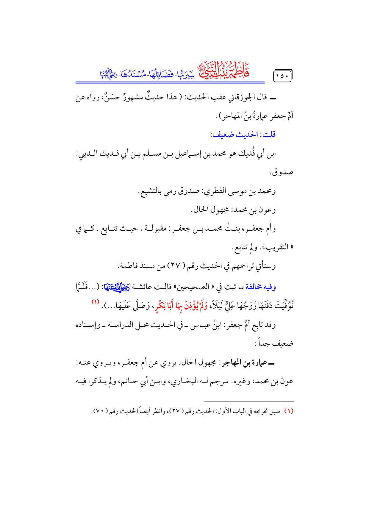 ــ قال الجوزقاني عقب الحديث: (هذا حديثٌ مشهورٌ حسَنٌ، رواه عن أمِّ جعفر عمارةُ بنُ المهاجر).
