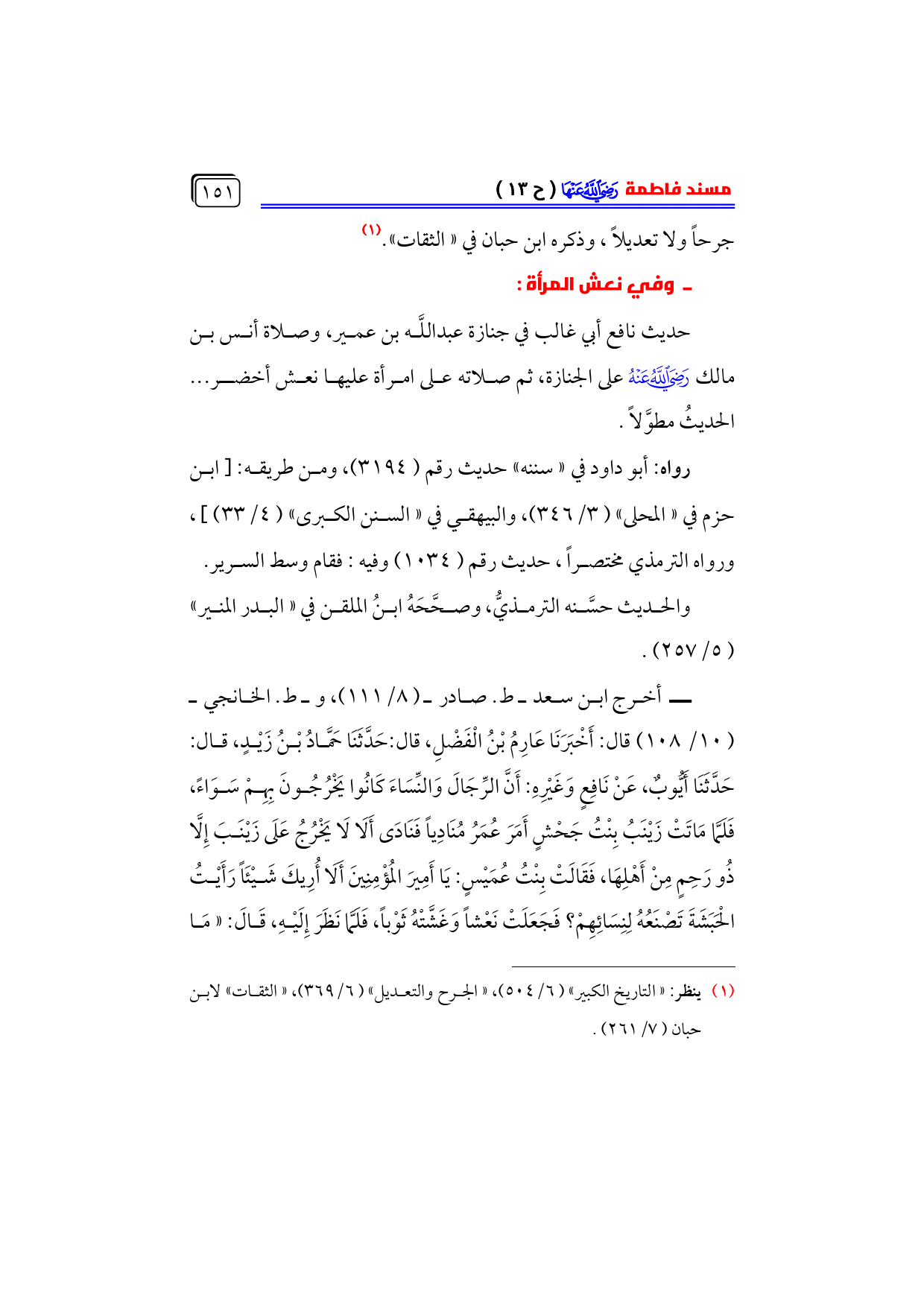 ــ أخرج ابن سعد ـ ط. صادر ـ (٨/ ١١١)، وـ ط. الخانجي ـ ... (١٠/ ١٠٨) قال: أَخْبَرَنَا عَارِمُ بْنُ الْفَضْلِ، قال: حَدَّثَنَا حَمَّادُ بْنُ زَيْدٍ، قال: حَدَّثَنَا أَيُّوبٌ، عَنْ نَافِعٍ وَغَيْرِهِ: أَنَّ الرِّجَالَ وَالنِّسَاءَ كَانُوا يَخْرُجُونَ بِهِمْ سَوَاءً، فَلَمَّا مَاتَتْ زَيْنَبُ بِنْتُ جَحْشٍ أَمَرَ عُمَرُ مُنَادِياً فَنَادَى أَلَا لَا يَخْرُجُ عَلَى زَيْنَبَ إِلَّا ذُو رَحِمٍ مِنْ أَهْلِهَا، فَقَالَتْ بِنْتُ عُمَيْسٍ: يَا أَمِيرَ المُؤْمِنِينَ أَلَا أُرِيكَ شَيْئَاً رَأَيْتُ الْحَبَشَةَ تَصْنَعُهُ لِنِسَائِهِمْ؟ فَجَعَلَتْ نَعْشاً وَغَشَّتْهُ ثَوْباً، فَلَمَّا نَظَرَ إِلَيْهِ، قَالَ: «مَا