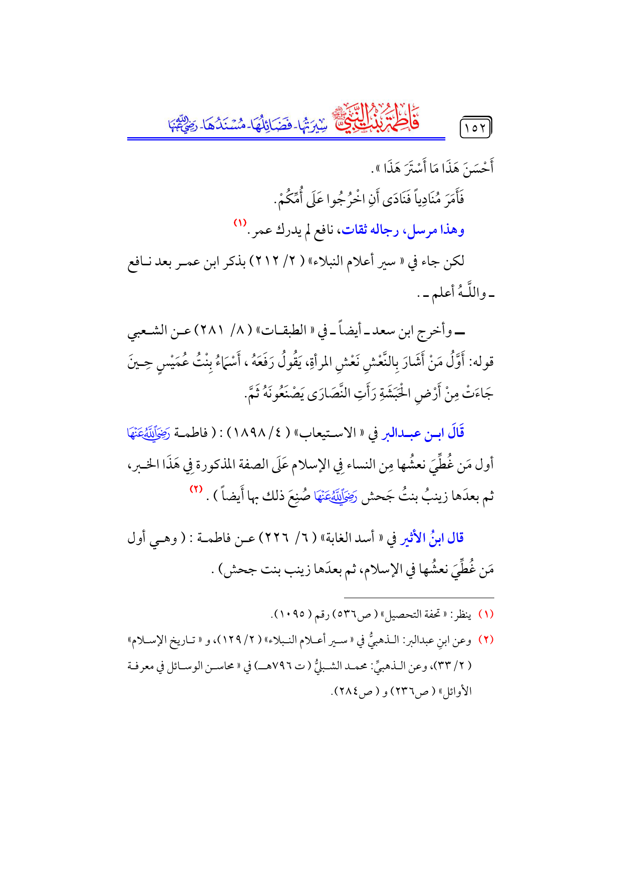 ــ وأخرج ابن سعد ـ أيضاً ـ في «الطبقات» (٨/ ٢٨١) عن الشعبي قوله: أَوَّلُ مَنْ أَشَارَ بِالنَّعْشِ نَعْشِ المرأةِ، يَقُولُ رَفَعَهُ، أَسْمَاءُ بِنْتُ عُمَيْسٍ حِينَ جَاءَتْ مِنْ أَرْضِ الْحَبَشَةِ رَأَتِ النَّصَارَى يَصْنَعُونَهُ ثَمَّ.