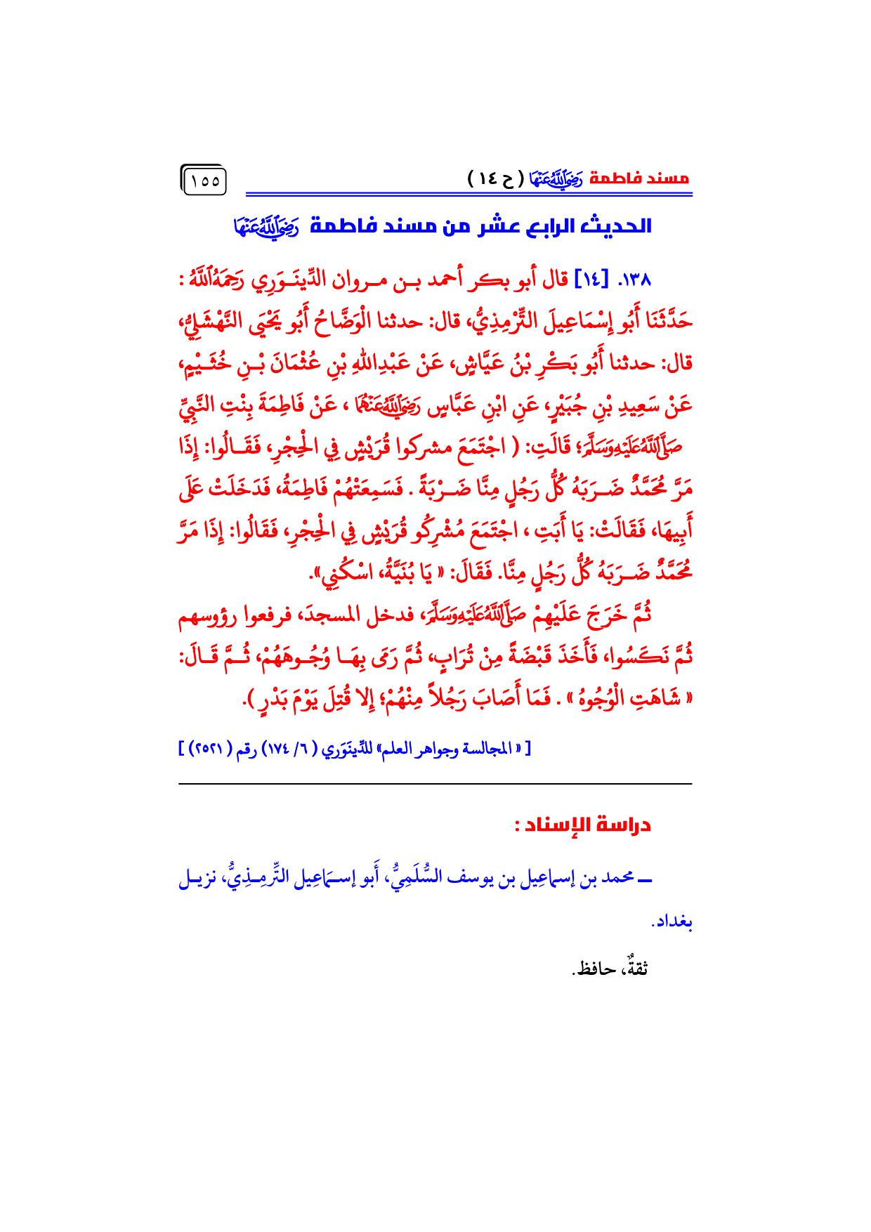 ١٣٨. [١٤] قال أبو بكر أحمد بن مروان الدِّينَوَرِي - رحمه الله -: حَدَّثَنَا أَبُو إِسْمَاعِيلَ التِّرْمِذِيُّ، قال: حدثنا الْوَضَّاحُ أَبُو يَحْيَى النَّهْشَلِيُّ، قال: حدثنا أَبُو بَكْرِ بْنُ عَيَّاشٍ، عَنْ عَبْدِاللهِ بْنِ عُثْمَانَ بْنِ خُثَيْمٍ، عَنْ سَعِيدِ بْنِ جُبَيْرٍ، عَنِ ابْنِ عَبَّاسٍ - رضي الله عنهما -، عَنْ فَاطِمَةَ بِنْتِ النَّبِيِّ - صلى الله عليه وسلم -؛ قَالَتِ: (اجْتَمَعَ مشركوا قُرَيْشٍ فِي الْحِجْرِ، فَقَالُوا: إِذَا مَرَّ مُحَمَّدٌ ضَرَبَهُ كُلُّ رَجُلٍ مِنَّا ضَرْبَةً. فَسَمِعَتْهُمْ فَاطِمَةُ، فَدَخَلَتْ عَلَى أَبِيهَا، فَقَالَتْ: يَا أَبَتِ، اجْتَمَعَ مُشْرِكُو قُرَيْشٍ فِي الْحِجْرِ، فَقَالُوا: إِذَا مَرَّ مُحَمَّدٌ ضَرَبَهُ كُلُّ رَجُلٍ مِنَّا. فَقَالَ: «يَا بُنَيَّةُ، اسْكُنِي».
