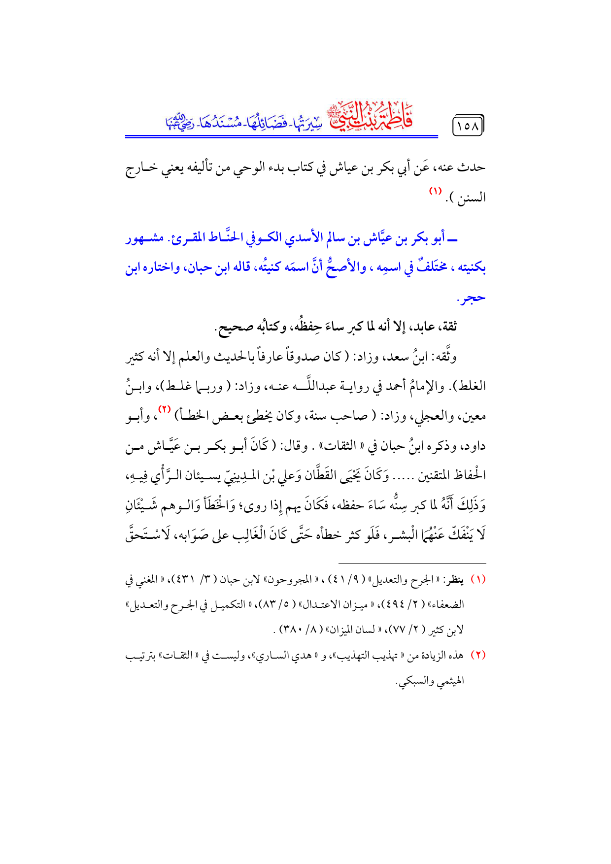 وثَّقه: ابنُ سعد، وزاد: (كان صدوقاً عارفاً بالحديث والعلم إلا أنه كثير الغلط). والإمامُ أحمد في رواية عبداللَّه عنه، وزاد: (وربما غلط)، وابنُ معين، والعجلي، وزاد: (صاحب سنة، وكان يخطئ بعض الخطأ) (¬٢)، وأبو داود، وذكره ابنُ حبان في «الثقات». وقال: (كَانَ أبو بكر بن عَيَّاش من الْحفاظ المتقنين ..... وَكَانَ يَحْيَى القَطَّان وَعلي بْن المدِينِيّ يسيئان الرَّأْي فِيهِ، وَذَلِكَ أَنَّهُ لما كبر سِنُّه سَاءَ حفظه، فَكَانَ يهم إِذا روى؛ وَالْخَطَأ وَالوهم شَيْئَانِ لَا يَنْفَكّ عَنْهُمَا الْبشر، فَلَو كثر خطأه حَتَّى كَانَ الْغَالِب على صَوَابه، لَاسْتَحقَّ