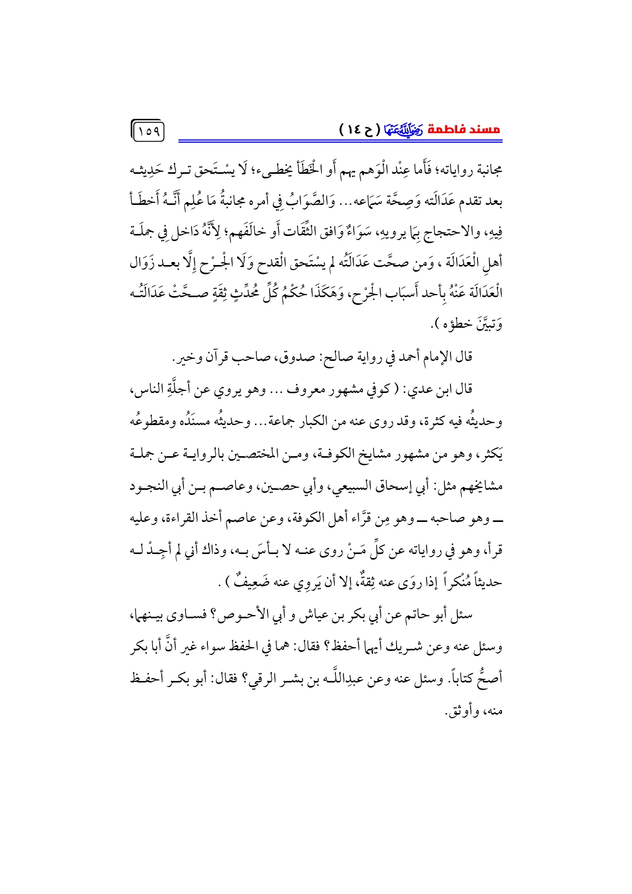 قال ابن عدي: (كوفي مشهور معروف ... وهو يروي عن أجلَّةِ الناس، وحديثُه فيه كثرة، وقد روى عنه من الكبار جماعة ... وحديثُه مسنَدُه ومقطوعُه يَكثر، وهو من مشهور مشايخ الكوفة، ومن المختصين بالرواية عن جملة مشايخهم مثل: أبي إسحاق السبيعي، وأبي حصين، وعاصم بن أبي النجود ... ــ وهو صاحبه ــ وهو مِن قرَّاء أهل الكوفة، وعن عاصم أخذ القراءة، وعليه قرأ، وهو في رواياته عن كلِّ مَنْ روى عنه لا بأسَ به، وذاك أني لم أجِدْ له حديثاً مُنْكراً إذا روَى عنه ثِقةٌ، إلا أن يَروِي عنه ضَعِيفٌ).