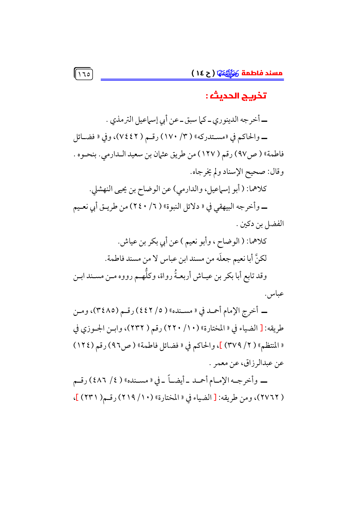 ــ أخرج الإمام أحمد في «مسنده» (٥/ ٤٤٢) رقم (٣٤٨٥)، ومن طريقه: [الضياء في «المختارة» (١٠/ ٢٢٠) رقم (٢٣٢)، وابن الجوزي في ... «المنتظم» (٢/ ٣٧٩)]، والحاكم في «فضائل فاطمة» (ص ٩٦) رقم (١٢٤) عن عبدالرزاق، عن معمر.