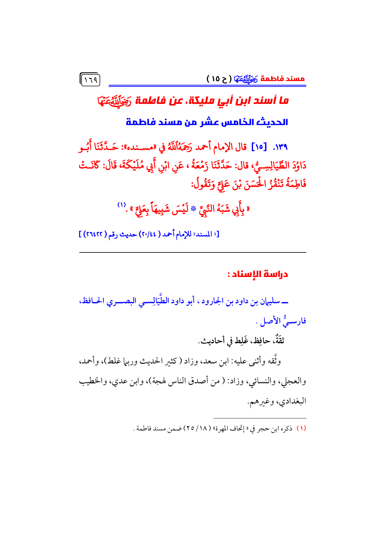 ١٣٩. [١٥] قال الإمام أحمد - رحمه الله - في «مسنده»: حَدَّثَنَا أَبُو دَاوُدَ الطَّيَالِسِيُّ، قال: حَدَّثَنَا زَمْعَةُ، عَنِ ابْنِ أَبِي مُلَيْكَةَ، قَالَ: كَانَتْ فَاطِمَةُ تَنْقُزُ الْحَسَنَ بْنَ عَلِيٍّ وَتَقُولُ: