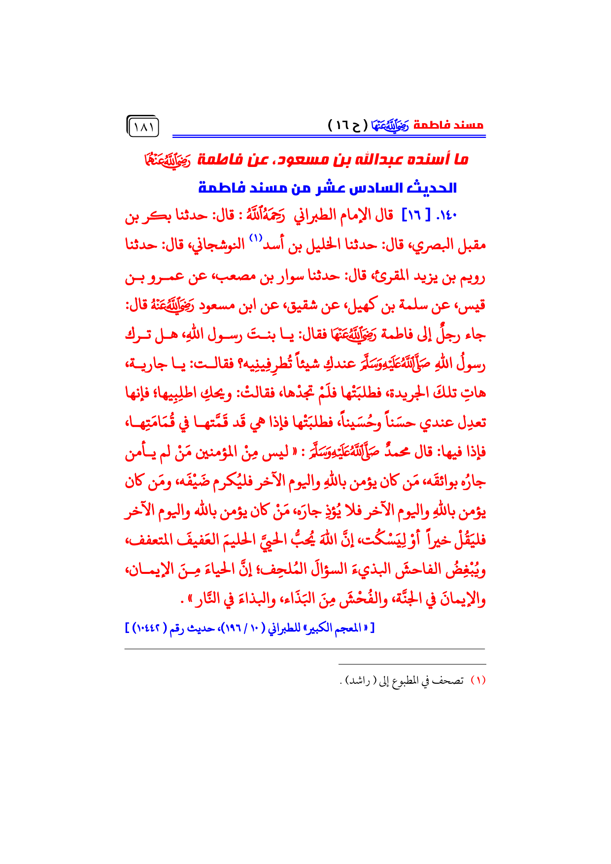 ١٤٠. [١٦] قال الإمام الطبراني - رحمه الله -: قال: حدثنا بكر بن مقبل البصري، قال: حدثنا الخليل بن أسد (¬١) النوشجاني، قال: حدثنا رويم بن يزيد المقرئ، قال: حدثنا سوار بن مصعب، عن عمرو بن قيس، عن سلمة بن كهيل، عن شقيق، عن ابن مسعود - رضي الله عنه - قال: جاء رجلٌ إلى فاطمة - رضي الله عنها - فقال: يا بنتَ رسول اللهِ، هل ترك ... رسولُ اللهِ - صلى الله عليه وسلم - عندكِ شيئاً تُطرِفِينِيه؟ فقالت: يا جارية، هاتِ تلكَ الجريدة، فطلبَتْها فلَمْ تجدْها، فقالتْ: ويحكِ اطلِبِيها؛ فإنها تعدِل عندي حسَناً وحُسَيناً، فطلبَتْها فإذا هي قَد قَمَّتها في قُمَامَتِها، فإذا فيها: قال محمدٌ - صلى الله عليه وسلم -: «ليس مِنْ المؤمنين مَنْ لم يأمن جارُه بوائقَه، مَن كان يؤمن باللهِ واليوم الآخر فليُكرم ضَيْفَه، ومَن كان يؤمن باللهِ واليوم الآخر فلا يُؤذِ جارَه، مَنْ كان يؤمن بالله واليوم الآخر فليَقُلْ خيراً أوْ لِيَسْكُت، إنَّ اللهَ يُحبُّ الحييَّ الحليمَ العَفيفَ المتعفف، ويُبْغِضُ الفاحشَ البذيءَ السؤالَ المُلحِف؛ إنَّ الحياءَ مِنَ الإيمان، والإيمانَ في الجنَّة، والفُحْشَ مِنَ البَذَاء، والبذاءَ في النَّار».