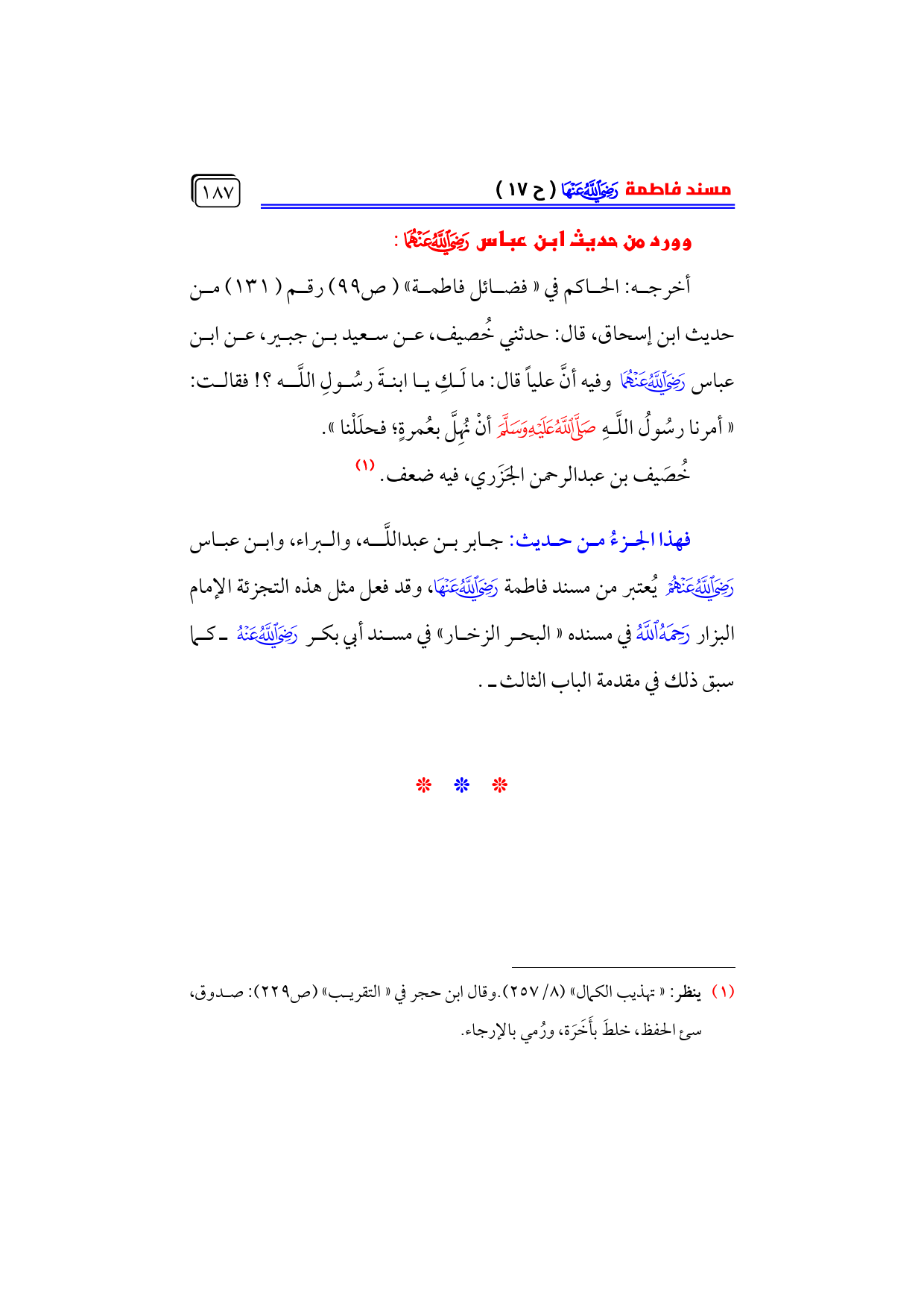 فهذا الجزءُ من حديث: جابر بن عبداللَّه، والبراء، وابن عباس - رضي الله عنهم - يُعتبر من مسند فاطمة - رضي الله عنها -، وقد فعل مثل هذه التجزئة الإمام البزار - رحمه الله - في مسنده «البحر الزخار» في مسند أبي بكر - رضي الله عنه - ـ كما سبق ذلك في مقدمة الباب الثالث ـ.